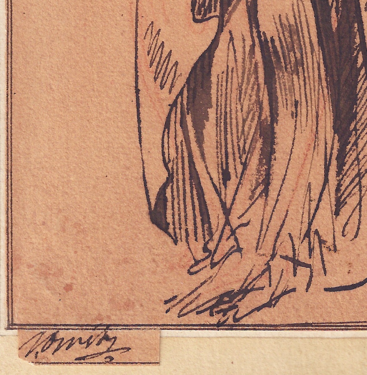 Plume et encre brune, sanguine, traits d'encadrement à l'encre brune, sur papier lavé brun clair, 217 x 115 mm