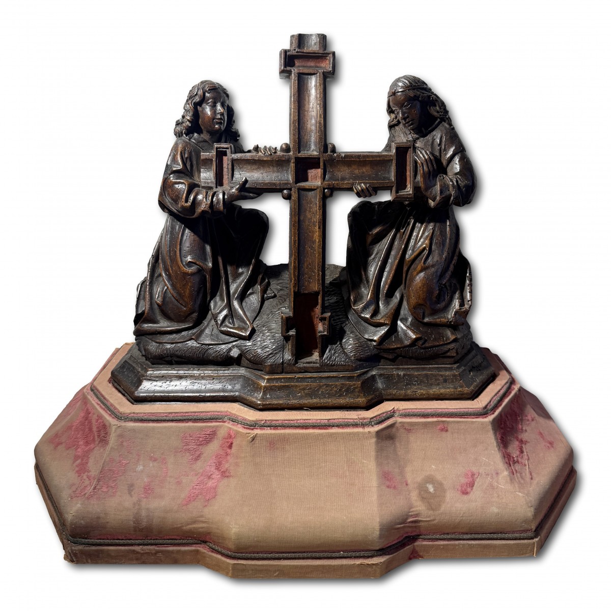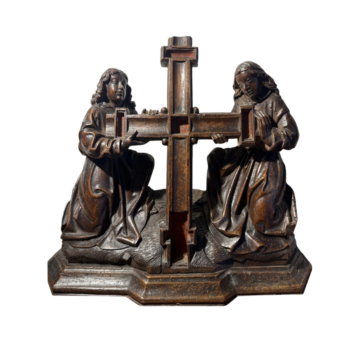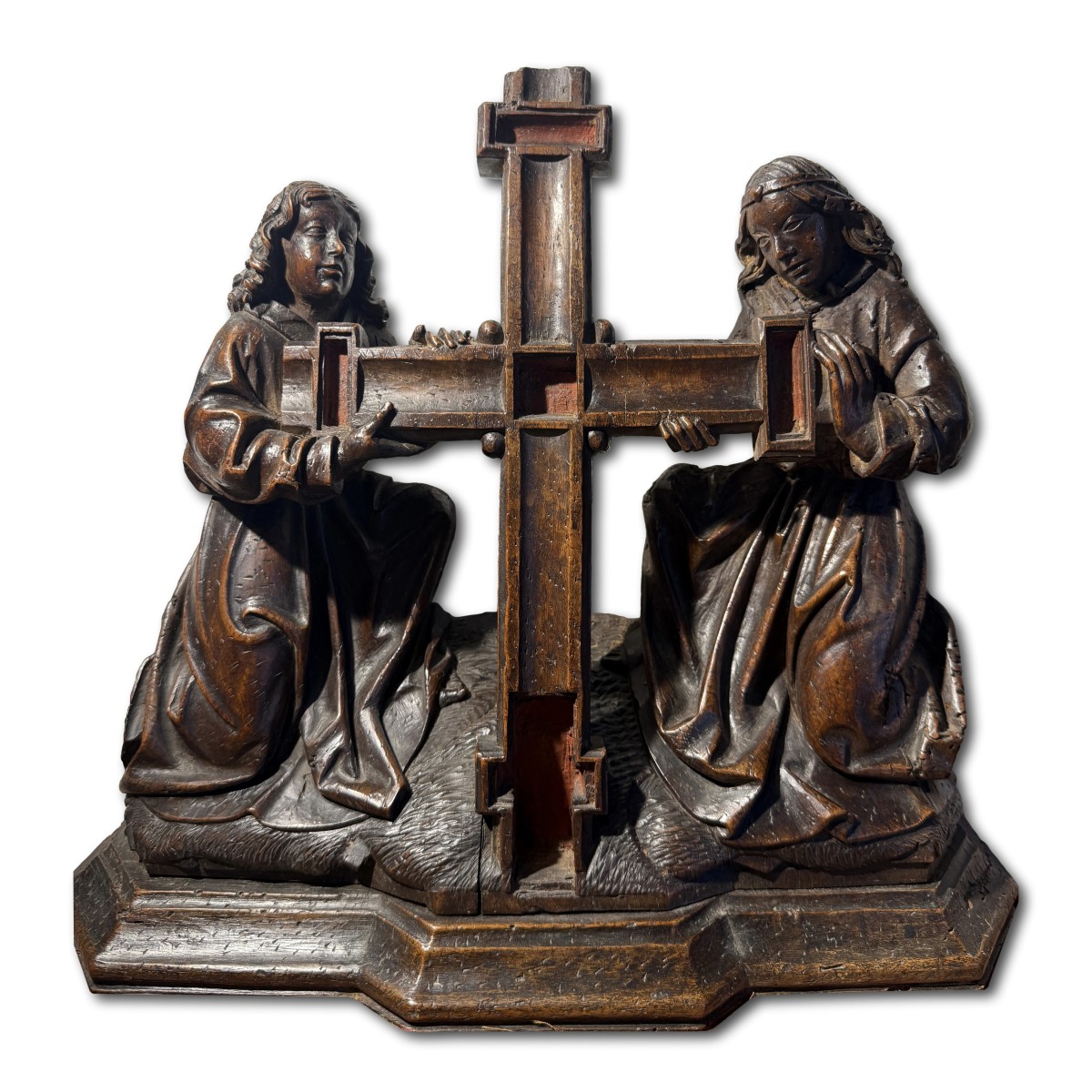 Groupe finement sculpté de style gothique tardif représentant deux anges agenouillés soutenant la Croix, réalisé en noyer à la patine profonde et ancienne. Les anges, représentés en adoration respectueuse, sont agenouillés sur un fond naturaliste, leurs drapés fluides formant de profonds plis anguleux. Chaque figure soutient délicatement la Croix de ses mains expressives et finement sculptées. Au revers, des ouvertures indiquent la présence d'ailes sculptées séparément, aujourd'hui disparues. Les compartiments en retrait à l'intérieur de la Croix, conservant des traces de pigment rouge, suggèrent qu'elle abritait à l'origine des reliques ou des fragments de la Vraie Croix.