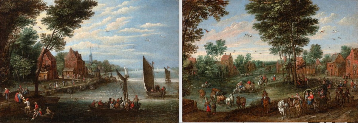 Ces deux pendentifs, remarquablement bien conservés, représentent des scènes idylliques de villages flamands, animées de paysans, de charrettes, de chevaux et de bacs – motifs caractéristiques du style de maturité de van Bredael. Les deux compositions sont baignées d'une lumière délicate, d'une profondeur atmosphérique subtile et d'un équilibre magistral entre architecture, personnages et nature.