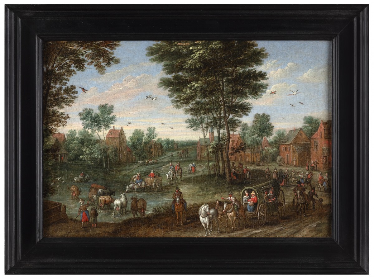 La précision avec laquelle l'artiste traite les petits personnages et les animaux, la douceur des transitions dans le ciel et l'harmonieuse palette de bruns chauds, de bleus tendres et de verts attestent de sa paternité. Ce duo illustre parfaitement la lignée brueghélienne si caractéristique de la génération de van Bredael : des compositions à la fois ordonnées et vivantes, où l'activité humaine et la sérénité pastorale coexistent dans une unité rythmique. Des exemples comparables incluent la paire de « Vues animées de village près d'une rivière » vendue chez Tajan, Paris, le 23 mars 2000 (lot 11), et la « Scène animée de village sur cuivre » vendue chez Sotheby's, le 10 avril 2003 (lot 7, signée et datée).