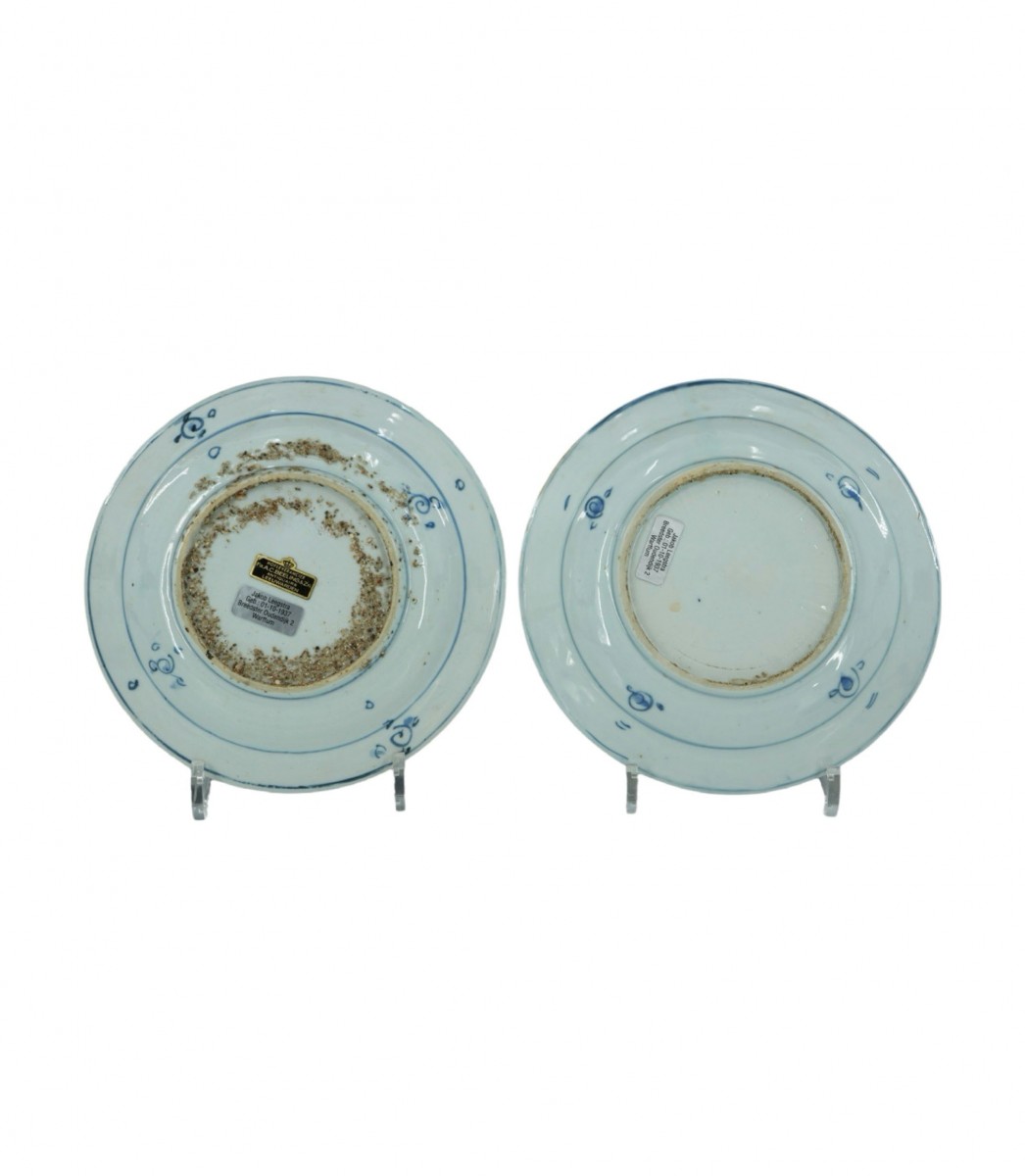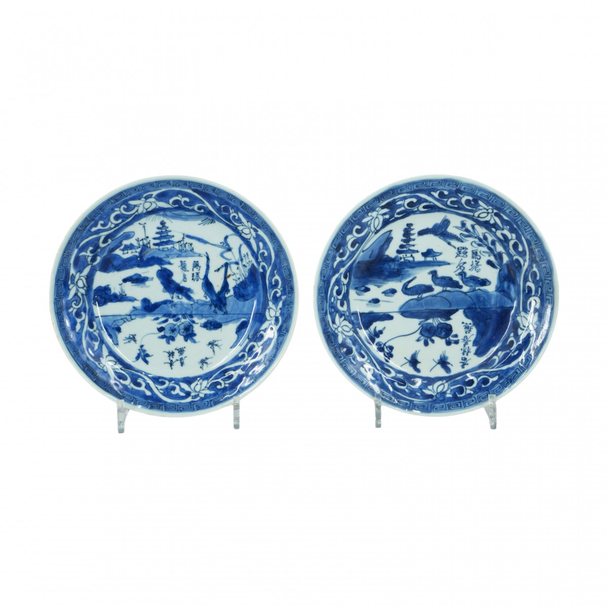 Deux plats bleus et blancs ornés d'inscriptions, représentant la « Pagode de l'Oie Sauvage », destinés au marché japonais, Ko-Sometsuke.