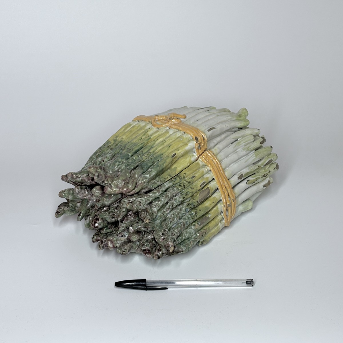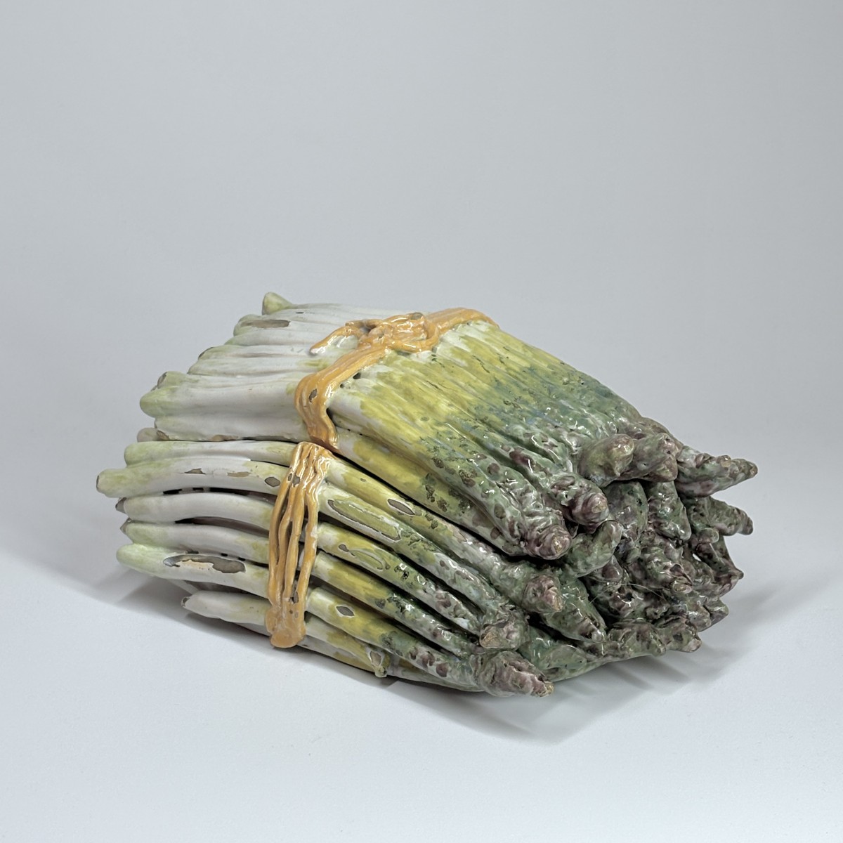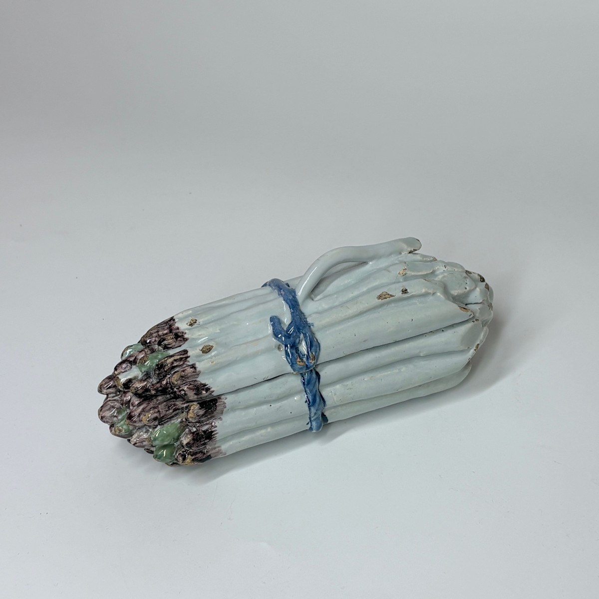 La terrine en forme d'une botte d'asperges nouées pas un ruban jaune, à décor au naturel.