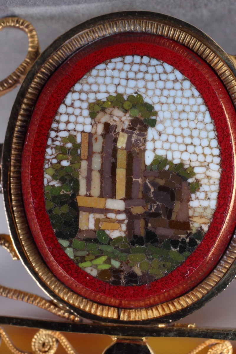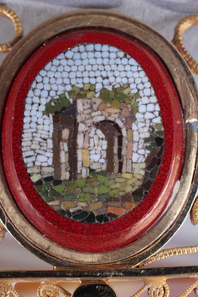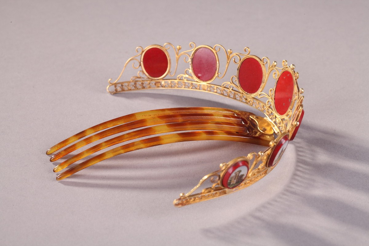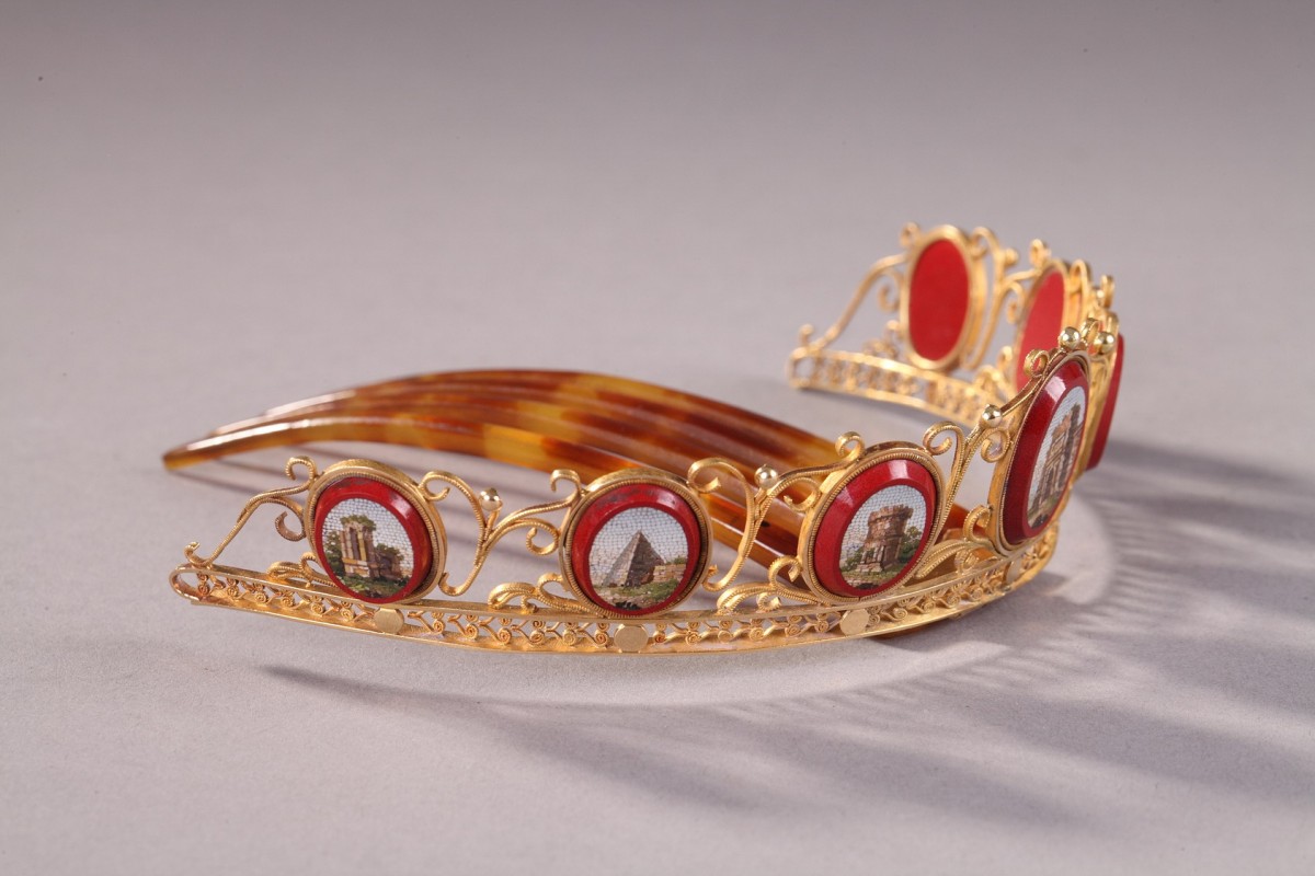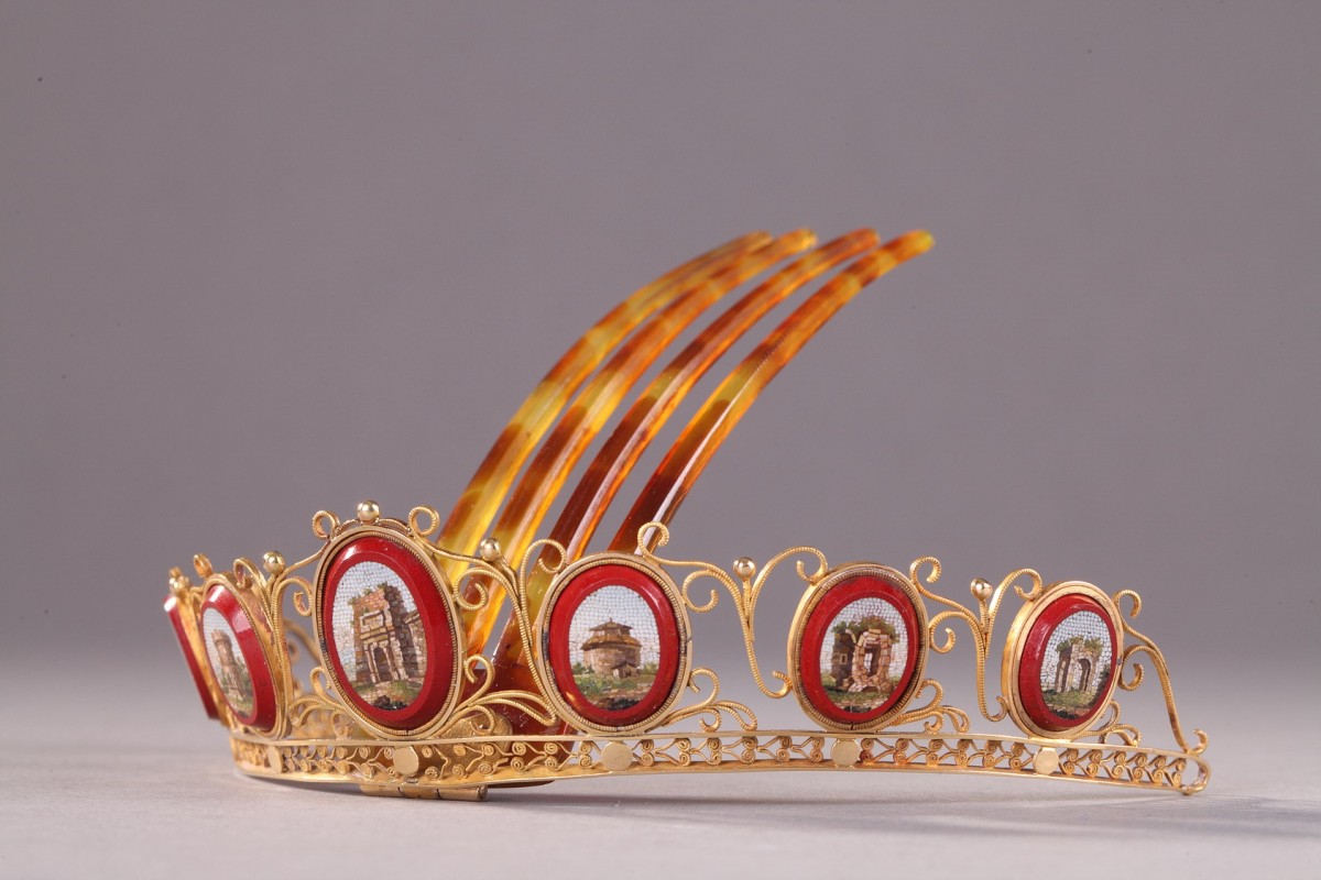 Peigne diadème en or 14 carat serti de sept médaillons ovales en micomosaique. Ce peigne diadème comporte une partie amovible en écaille blond comprenant quatre griffes. De forme courbe, il présente des médaillons en micromosaique sur fond de verre de couleur purpurine. Chaque médaillon décrit un paysage ou monument de la Rome antique dont la tombe de Cecilia Metella, la pyramide de Cestius, et d’autres vues du campo Vaccino ou forum dont le temple de Jupiter. Ces vues sont à rapprocher des estampes de Domenico Pronti. Ces médaillons sont sertis dans un élégant travail de filigrane formant des enroulements et souligné par une frise de feuillage stylisée. C’est au début du XIXe siècle que l’on assiste au renouveau de ces ornements de cheveux.