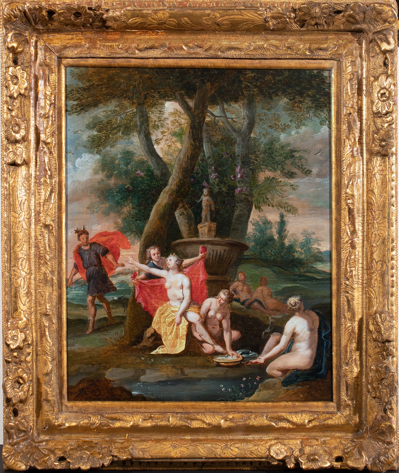 ... délicat , typique de la peinture flamande du XVIIe . Frans Wouters peintre anversois formé auprès de Rubens est connu pour ses petits formats aux sujets mythologiques et religieux , souvent réalisés sur bois . Collaborateur de Jan Brueghel le Jeune , il excelle dans les scènes de cabinet , où se mêlent figures élégantes et paysages raffinés .Ce tableau , par son format , sa palette lumineuse et la finesse du dessin , s’inscrit dans la tradition des peintres flamands influencés par Rubens et Brueghel . Le traitement du feuillage , la fluidité des drapés et la sensualité maîtrisée des figures féminines sont caractéristiques de l’art de Wouters .Le cadre ancien , richement sculpté et doré , complète l’œuvre avec élégance. Ses dimensions généreuses (51 × 44 cm) mettent en valeur la scène tout en soulignant son caractère précieux et intime