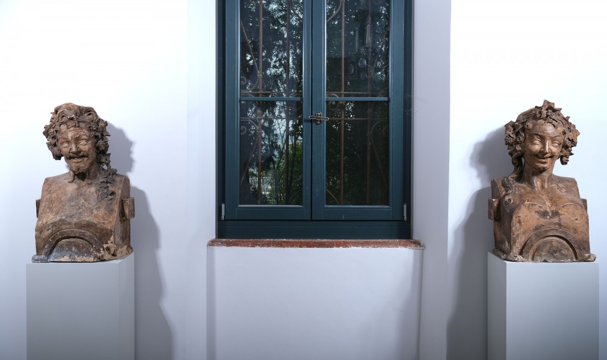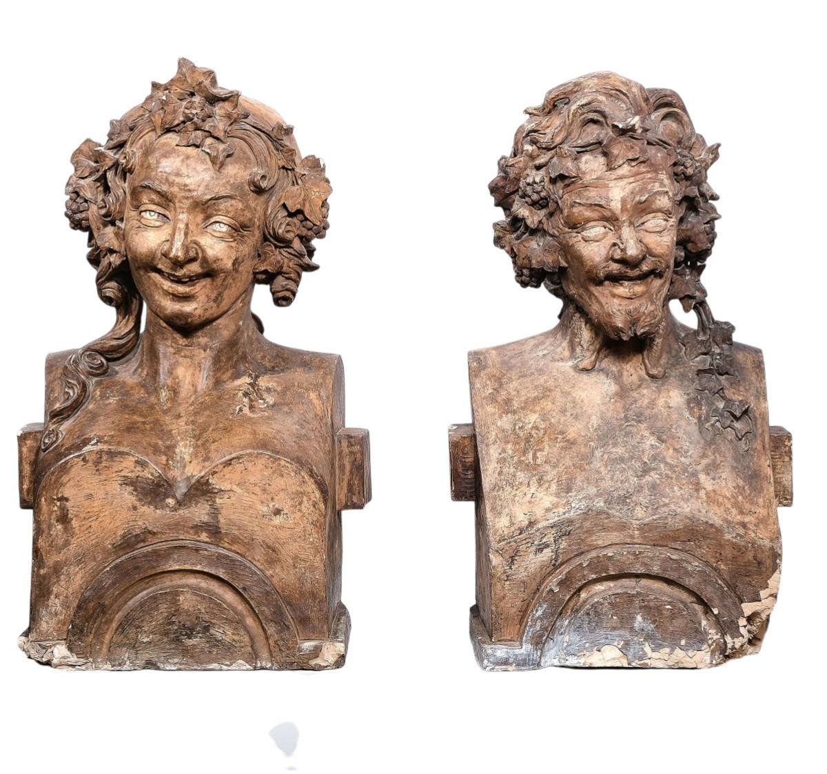 Les deux bustes étaient probablement destinés à servir de chapiteaux de pilastres et rappellent un peu la Comedia del Arte. Ils ont conservé une très belle patine vieillie et présentent quelques petites éraflures.