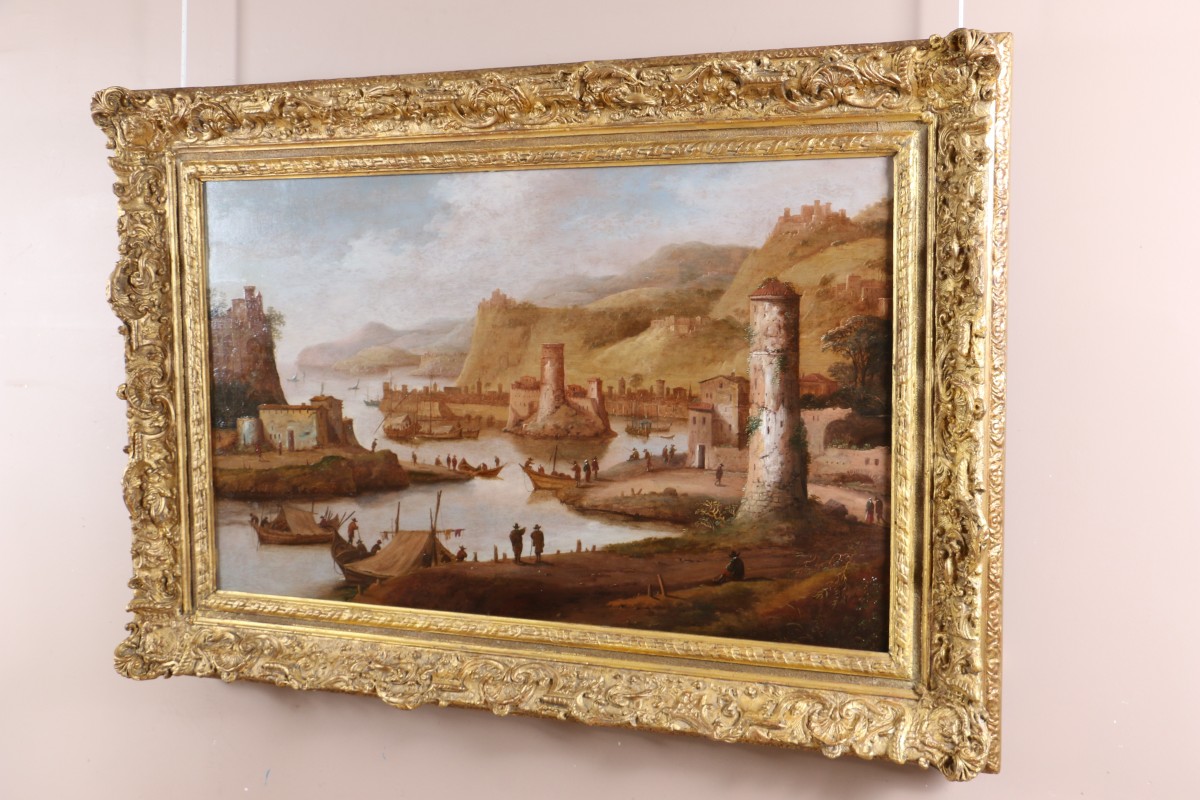 L’artiste nous propose un vaste et superbe paysage portuaire méditerranéen, animé de personnages et baigné d’une lumière dorée caractéristique de son œuvre. La composition s’articule autour d’un bassin maritime entouré de collines et de constructions fortifiées. Au centre, une forteresse circulaire bâtie sur un îlot rocheux domine la scène ; des embarcations s’en approchent, tandis que des voiliers glissent sur les eaux calmes du port. A l’arrière une grande cité fortifiée.