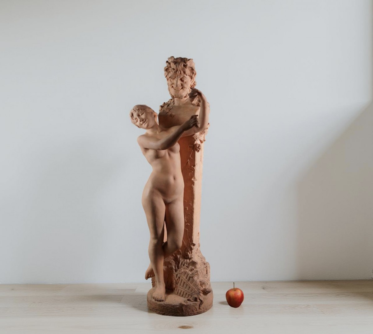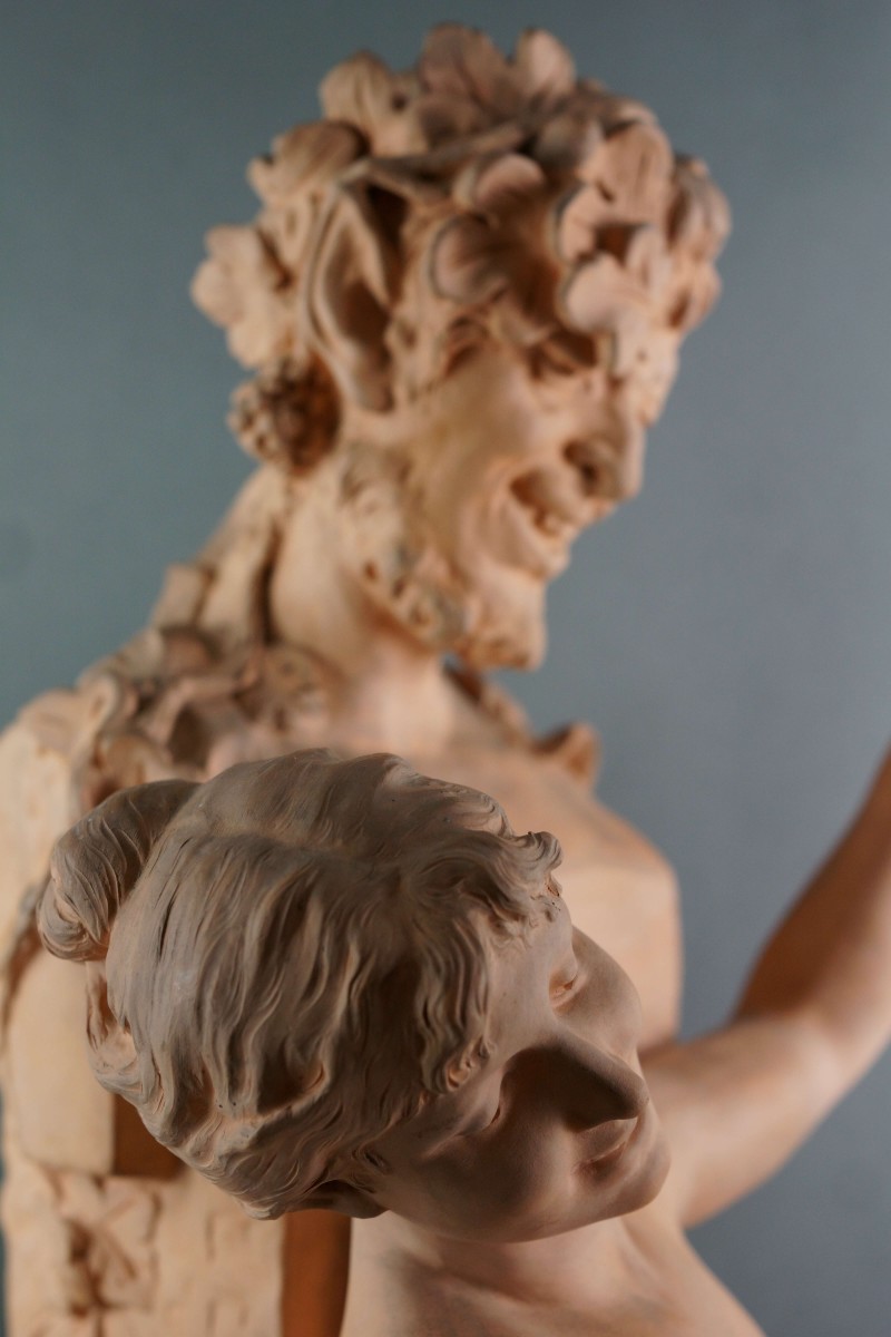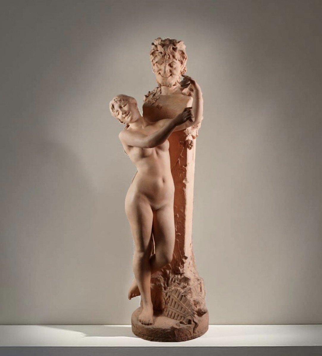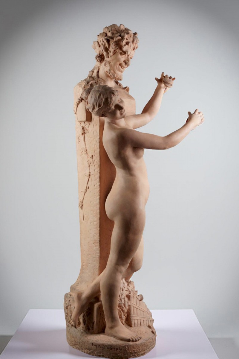 "La Bacchante", imposante groupe en terre cuite portant la signature de Domien van den Bossche. Fin du 19éme siècle.