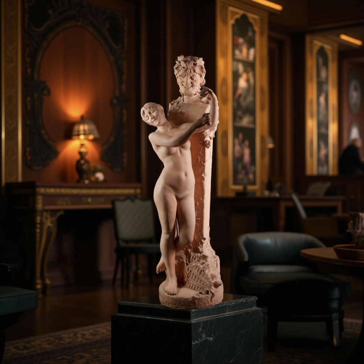 Probablement inspirée du groupe « La Bacchante » de Carrier Belleuse de 1863, cette terre cuite met en scène une jeune nymphe dansant au son des castagnettes autour de l'hermès d'un satyre. Le groupe présente déjà des traces de l'Art Nouveau, notamment dans le visage souriant et expressif de la jeune nymphe et dans l'accent mis sur son mouvement.