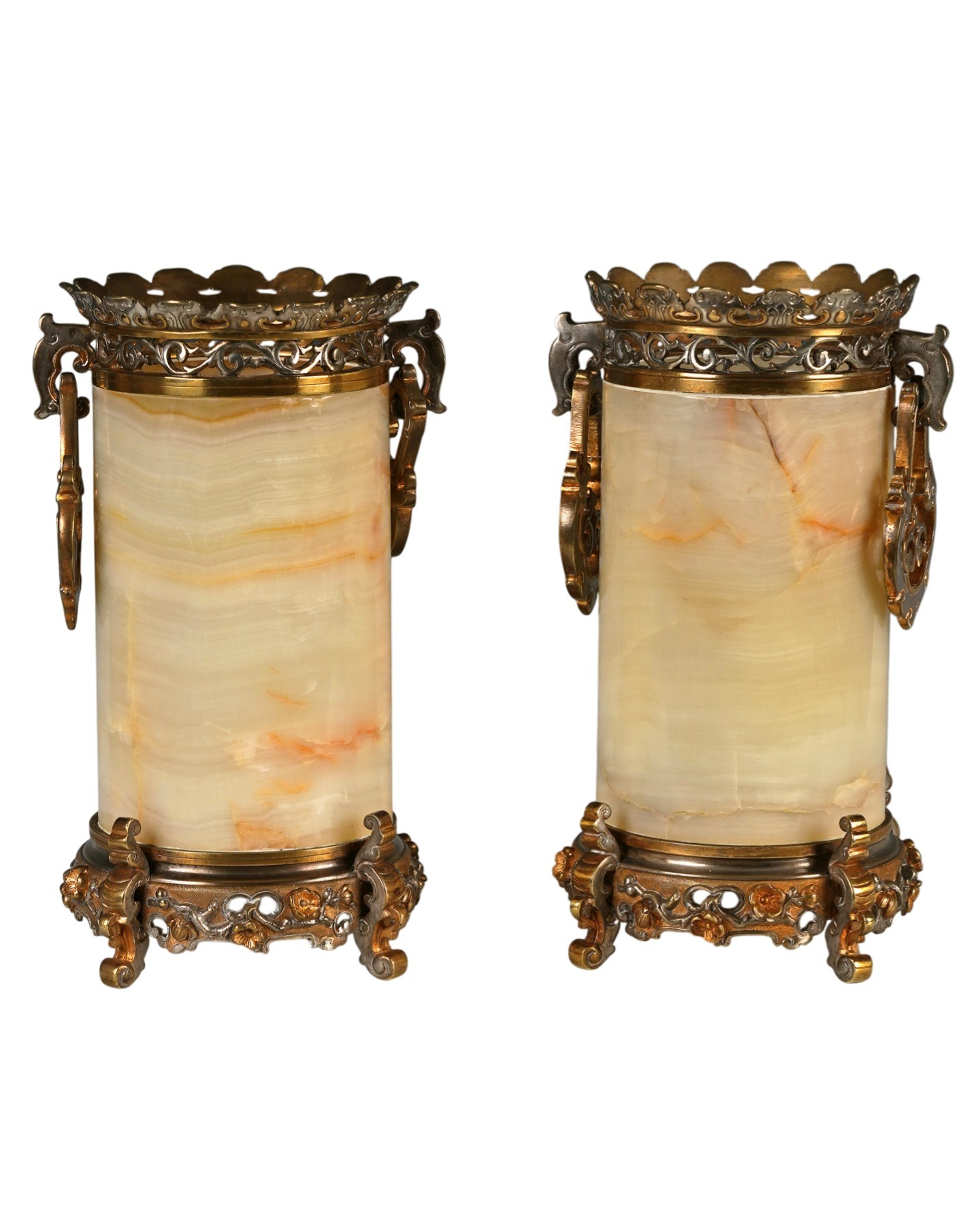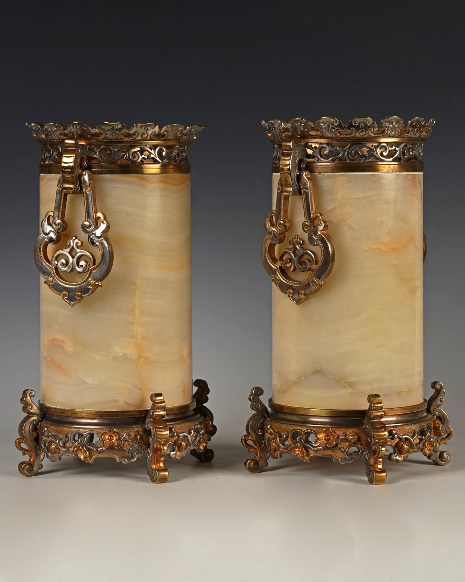 Cette belle paire de vases de forme rouleau attr. à E. Cornu est constituée de corps cylindriques en onyx, cerclés d’une monture en bronze ciselé à rehauts dorés et argentés, formant un élégant contraste chromatique. La partie supérieure est ceinte d’une galerie ajourée à décor de rinceaux et de motifs stylisés. De part et d’autre sont fixées des anses mobiles à décor d’enroulements. Ils reposent sur des bases circulaires, ornées de fleurs de cerisier, soutenues par pieds en volutes soulignés de motifs floraux et de feuilles stylisées.