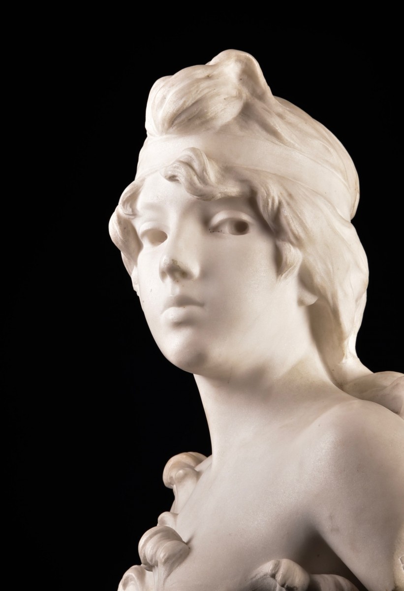 Ce buste raffiné en marbre de Carrare, signé E. Villanis, représente Nymphe, une évocation délicate et poétique de la figure féminine chère à Emmanuel Villanis (1858–1914). Artiste majeur de la fin du XIX? et du début du XX? siècle, Villanis est renommé pour ses portraits féminins expressifs, marqués par des lignes fluides, des regards sereins et une esthétique subtilement Art nouveau.
