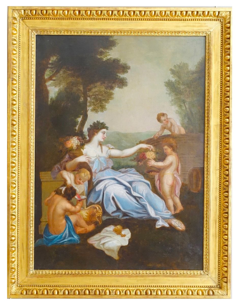 Ecole Française de la fin du 18e siècle, grande huile sur toile représentant une scène mythologique bachanale. Assise dans un paysage, une bachante tire de sa corne d'abondance des grappes de raisins qu'elle donne à de jeunes putti Bacchus pour qu'ils puissent tirer le vin et le servir aux invités. Le tableau de grand format est présenté dans un superbe et monumental cadre de style Louis XVI, riche modèle à raies d'oves doré à la feuille d'or.