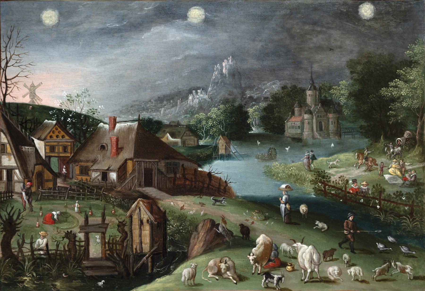Ce tableau représente un paysage rural animé, se déployant dans une atmosphère matinale, dominée par un ciel sombre ponctué de trois astres lumineux. La composition s’organise autour d’un plan d’eau central, qui structure l’espace et relie les différents groupes de figures disséminés dans le paysage.