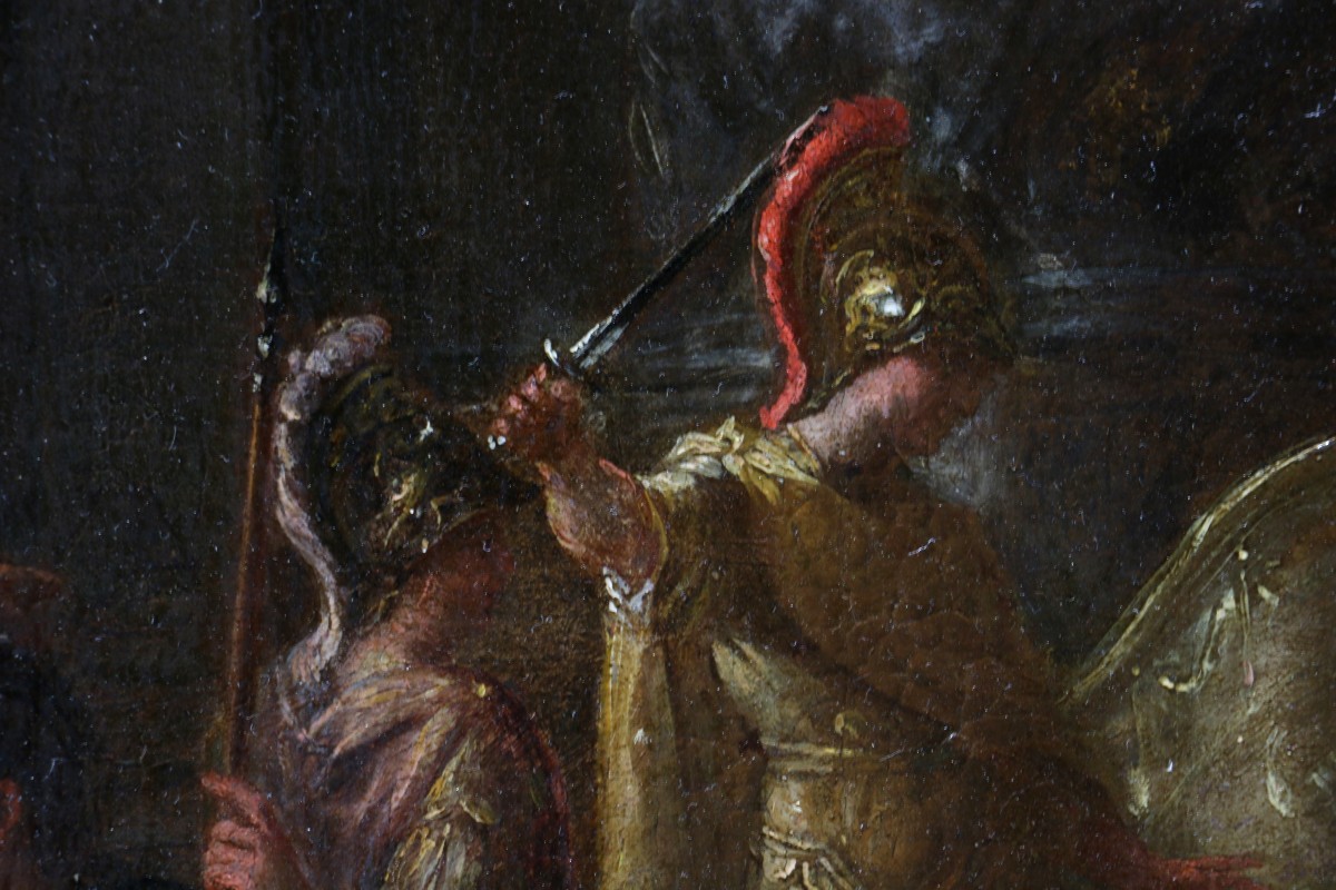 Quant aux sujets d’histoire antique, ils semblent avoir été extrêmement rares. Or, le tableau que nous présentons a ceci d’original qu’il illustre un trait de la vie d’Alexandre le Grand conté notamment par Plutarque. La scène se situe après la déroute les Perses suite au passage du Granique. Parvenu dans la ville de Gordyum, il découvre un char dont la particularité est son joug relié, la tradition locale voulant que l’univers serait promis à celui qui parviendrait à délier ce nœud inextricable.
