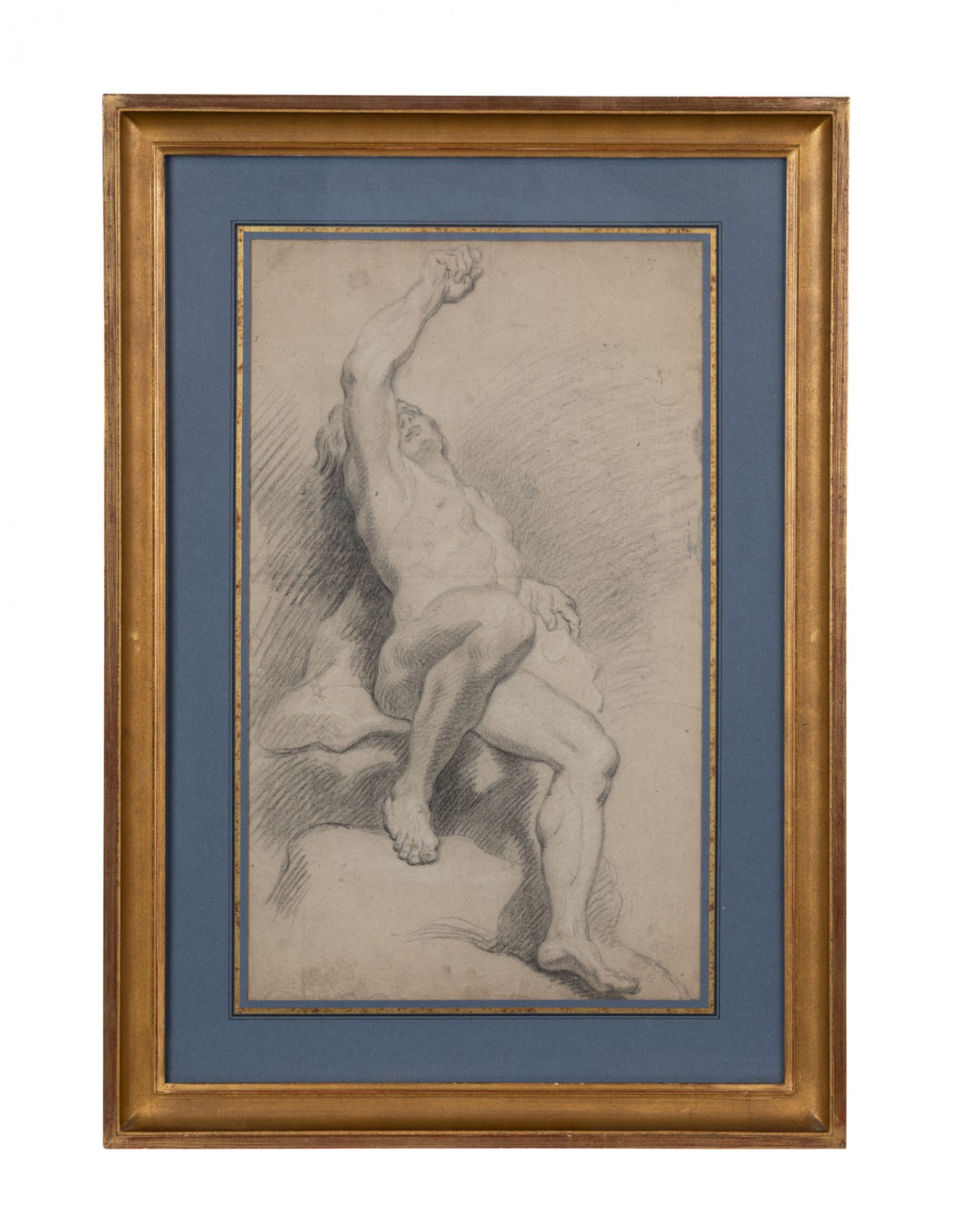 Ce dessin représente une étude académique d’un nu masculin, assis sur un rocher, le bras droit levé.