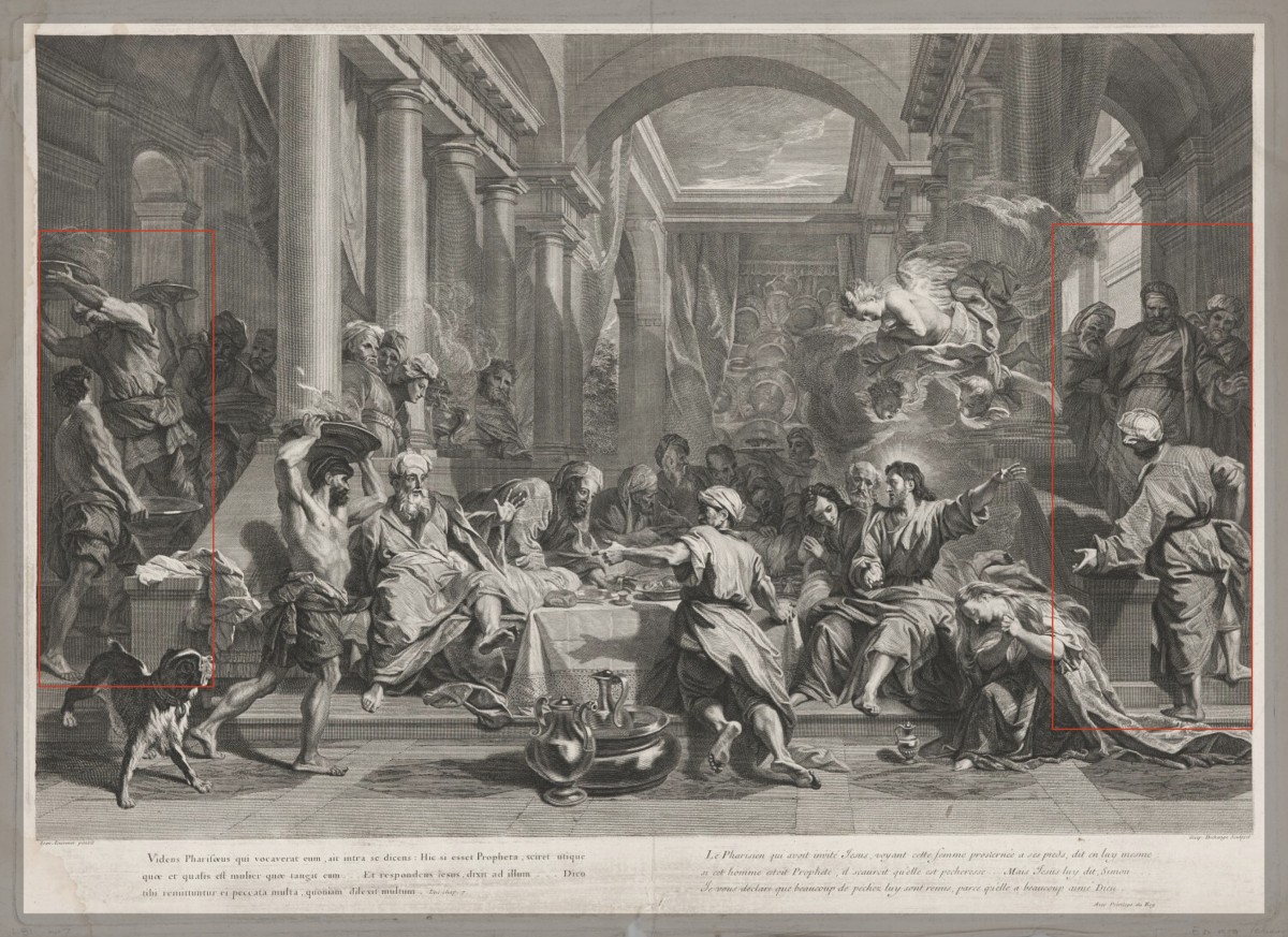 Cette feuille d’étude s’inscrit dans la tradition académique du XVIIIe siècle, où la copie d’après les maîtres, souvent médiatisée par l’estampe, constitue un exercice fondamental de formation. Inspirée du Repas chez Simon le Pharisien de Jean Jouvenet, œuvre majeure de la peinture religieuse française du début du XVIIIe siècle, elle témoigne de la diffusion des modèles par le biais de la gravure, ici celle de Gaspard Duchange. Cette dernière, publiée dès 1705, joue un rôle essentiel dans la transmission des compositions, notamment en raison de son inversion qui modifie subtilement la lecture des figures.