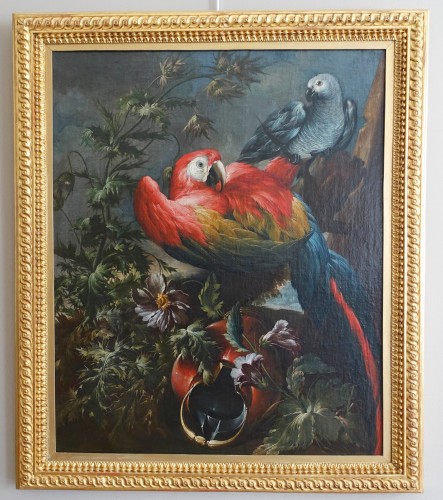 Ecole Hollandaise du 17e siècle, Perroquet Ara Rouge et perruche grise, juchés sur une canne à lait en cuivre rouge dans un sous bois. Au fond d'une percée, un paysage avec un village. Huile sur toile, le tableau est présenté dans un très beau cadre à rang de piastres d'époque Louis XVI en chêne sculpté et doré à la feuille d'or. Attribué à Matthias Withoos ou son atelier.
