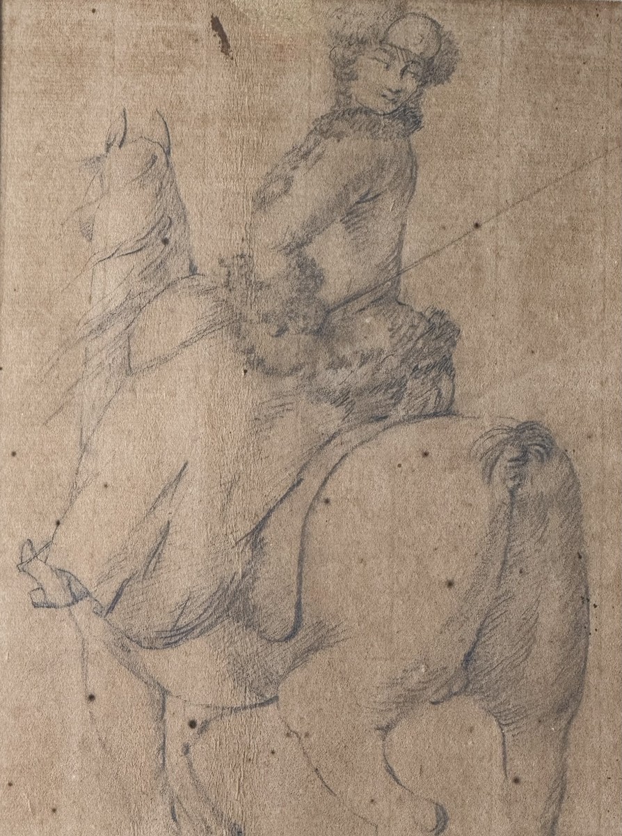 École d'Europe du Nord du début du XVIIIe siècle - Portrait équestre d'une jeune femme élégamment vêtue, craie noire sur papier à traits fins et chaînes apparentes ; quelques touches d'encre brune.
