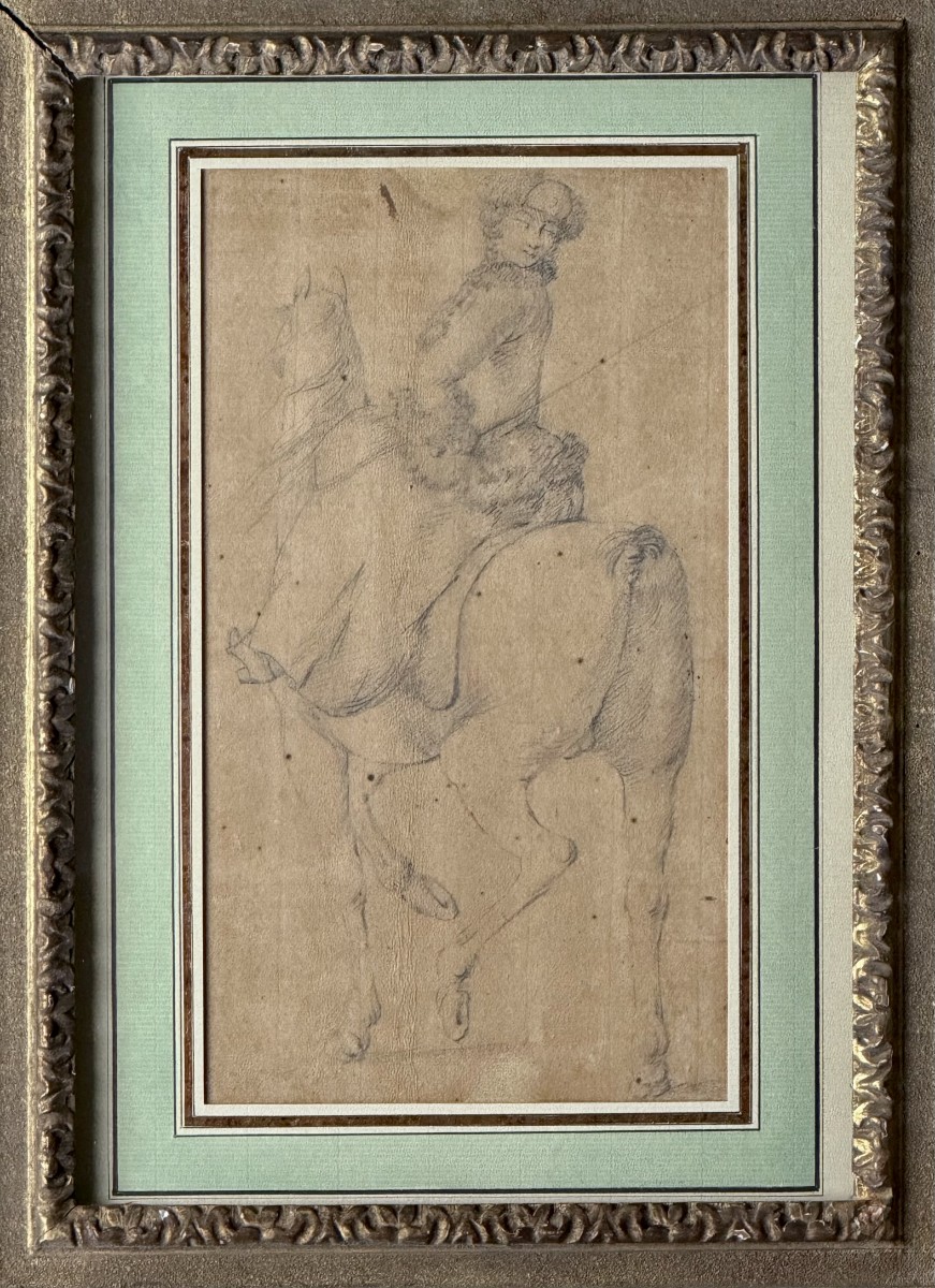 Quant à son attribution, notre dessin provient vraisemblablement du milieu artistique nord-européen, français ou allemand. Des artistes allemands tels que Johann Elias Ridinger (1698-1767) et Wilhelm Kobell (1766-1855), célèbres pour leurs représentations équestres, diffusaient leurs compositions sous forme d'estampes représentant souvent des chevaux isolés dans des contextes variés, avec ou sans cavalier, et avec ou sans sellerie. Un artiste français du XVIIIe siècle, également renommé pour ses sujets équestres, est le peintre de batailles Charles Parrocel (1688-1752), dont l'œuvre est visible dans son eau-forte représentant un cavalier, datant de 1737 (British Museum, n° d'inv. 1861,1012.107).
