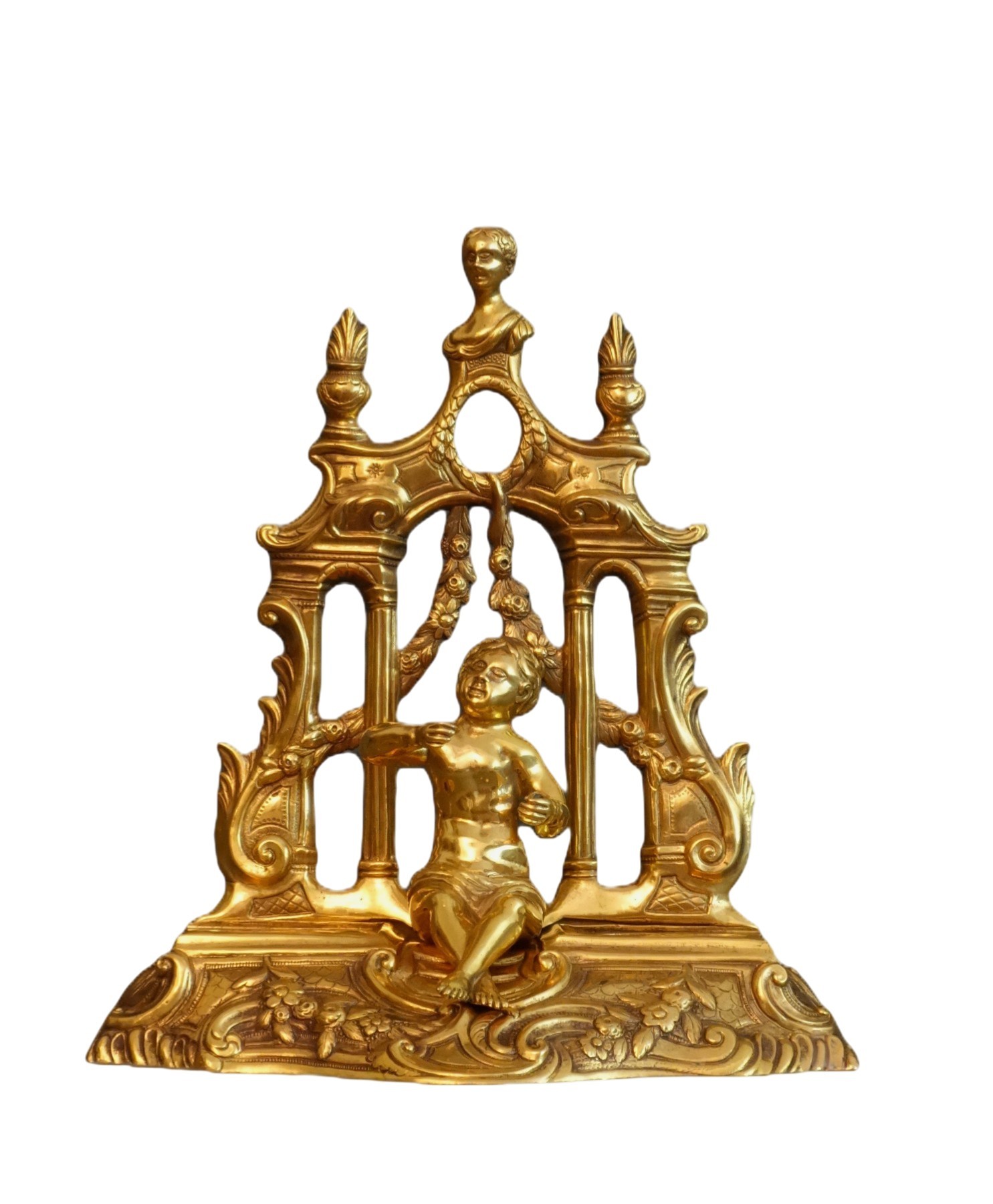 Cette exceptionnelle écritoire à transformations fait à la charnière du XVIème et XVIIème siècle représente une entrée monumentale de jardin , portée par des colonnes cannelées , sommée d'un fronton, avec des pots à feux et un oculus traversé d'une guirlande de fleurs. Un buste de femme domine cet élément architectural. Devant en paire, de larges pots couverts sont toujours dans le registre du jardin ornemental, ils reproduisent les grands vases d'extérieurs et sont ornés aussi de guirlandes de fleurs. L'ensemble repose sur une base en terrasse naturaliste stylisée , ornée de volutes et fleurs. Assis sous l'arcade , un putto sert à tenir les plumes durant l'écriture dans ses mains et une gouttière au dos de l'écritoire sert à les ranger.