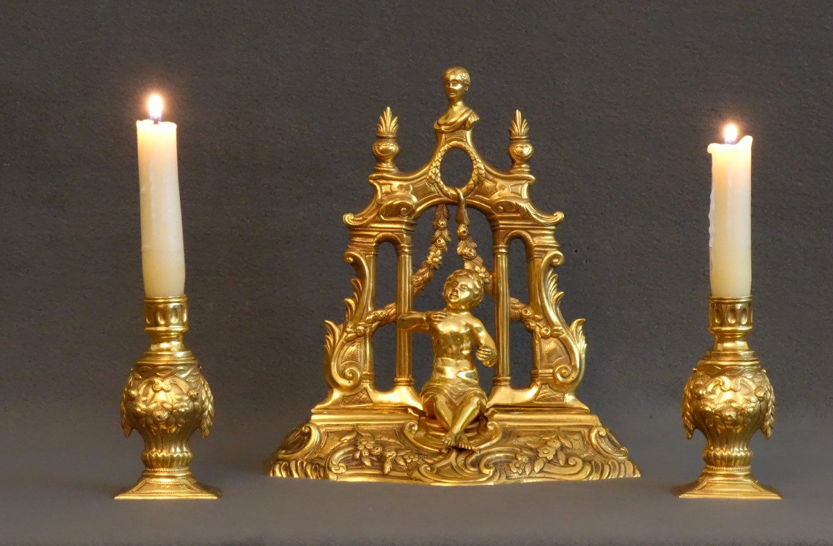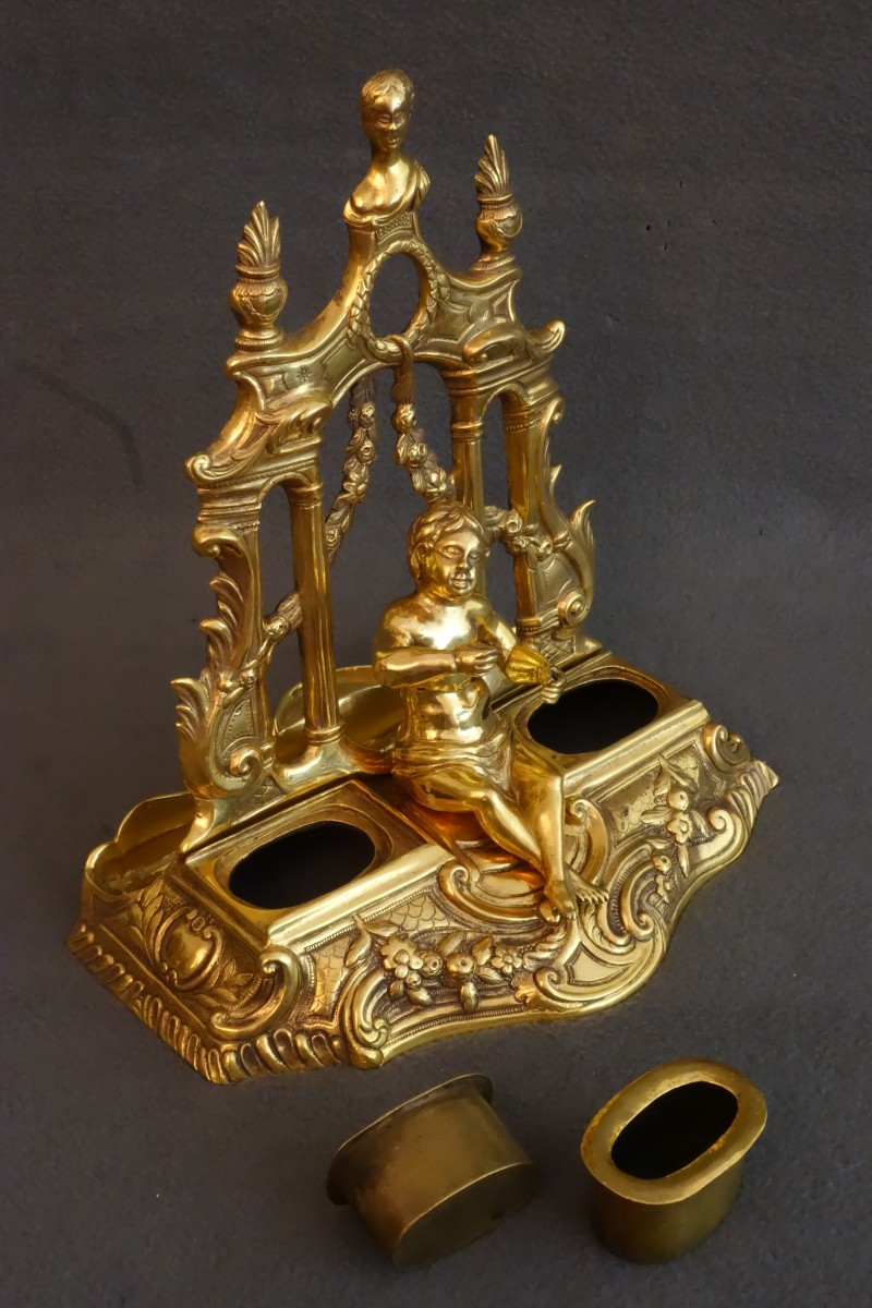 De part et d'autre du putto sont donc les deux vases dont les couvercles sont en fait des bougeoirs réversibles; ils coulissent pour laisser apparaître les godets d'encre.