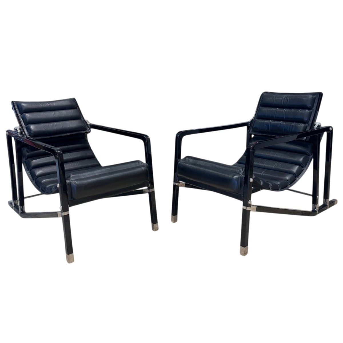Rare paire de fauteuils “Transat” à structure en bois laqué noir formant un cadre rectiligne aux lignes épurées. Le piétement, à section carrée, est renforcé par des éléments métalliques visibles, soulignant la construction et apportant un contraste discret.