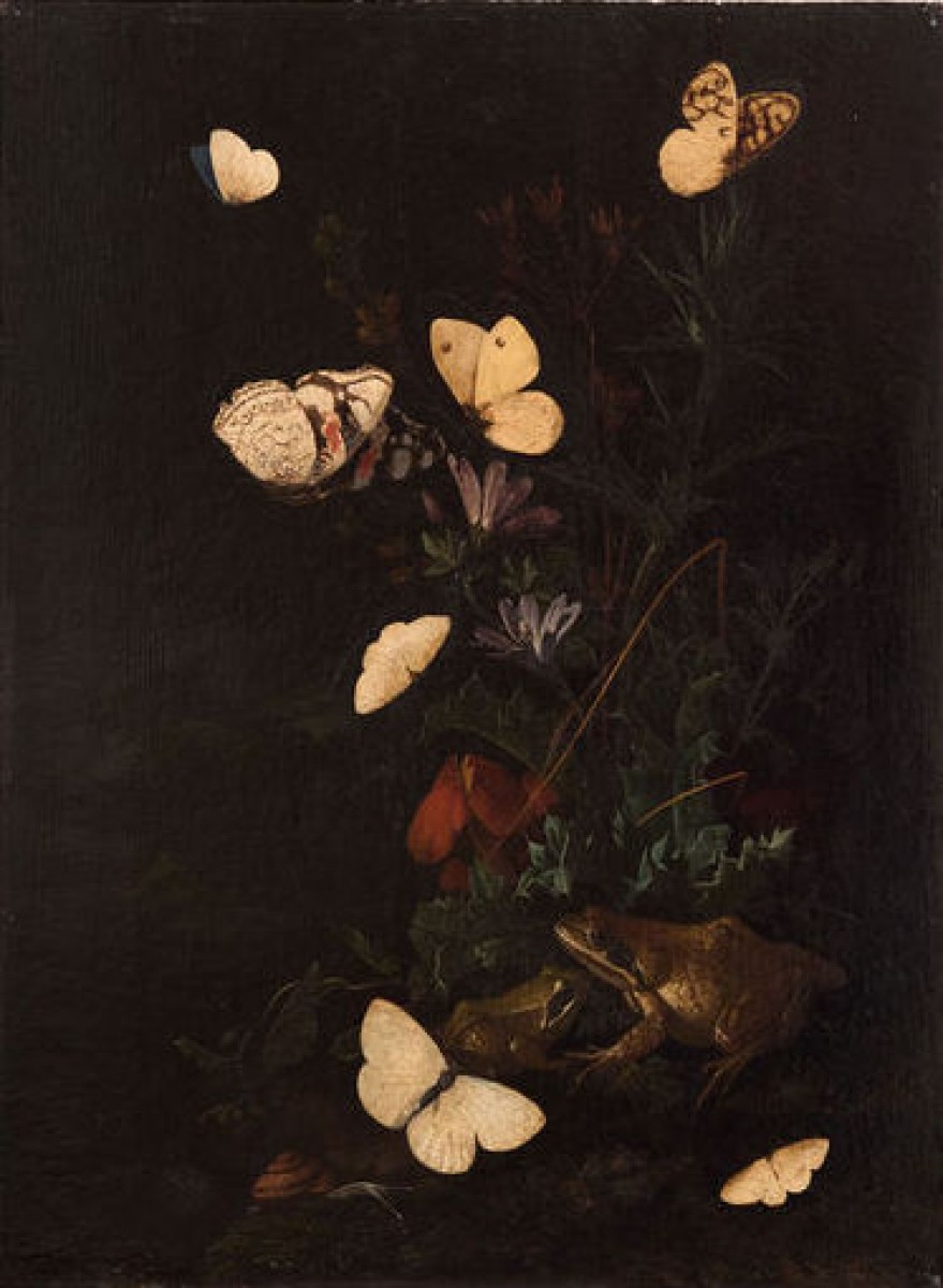 Dans la partie inférieure de l’une des peintures apparaît une grenouille, posée sur un sol sombre et humide, accompagnée de petits êtres tels qu’un escargot et une chenille. Ces créatures sont intégrées au sol et à la végétation, renforçant l’impression d’un milieu naturel dense et clos.