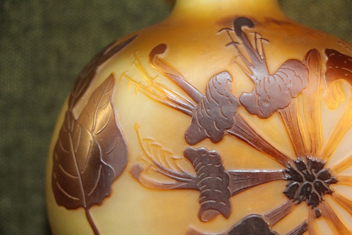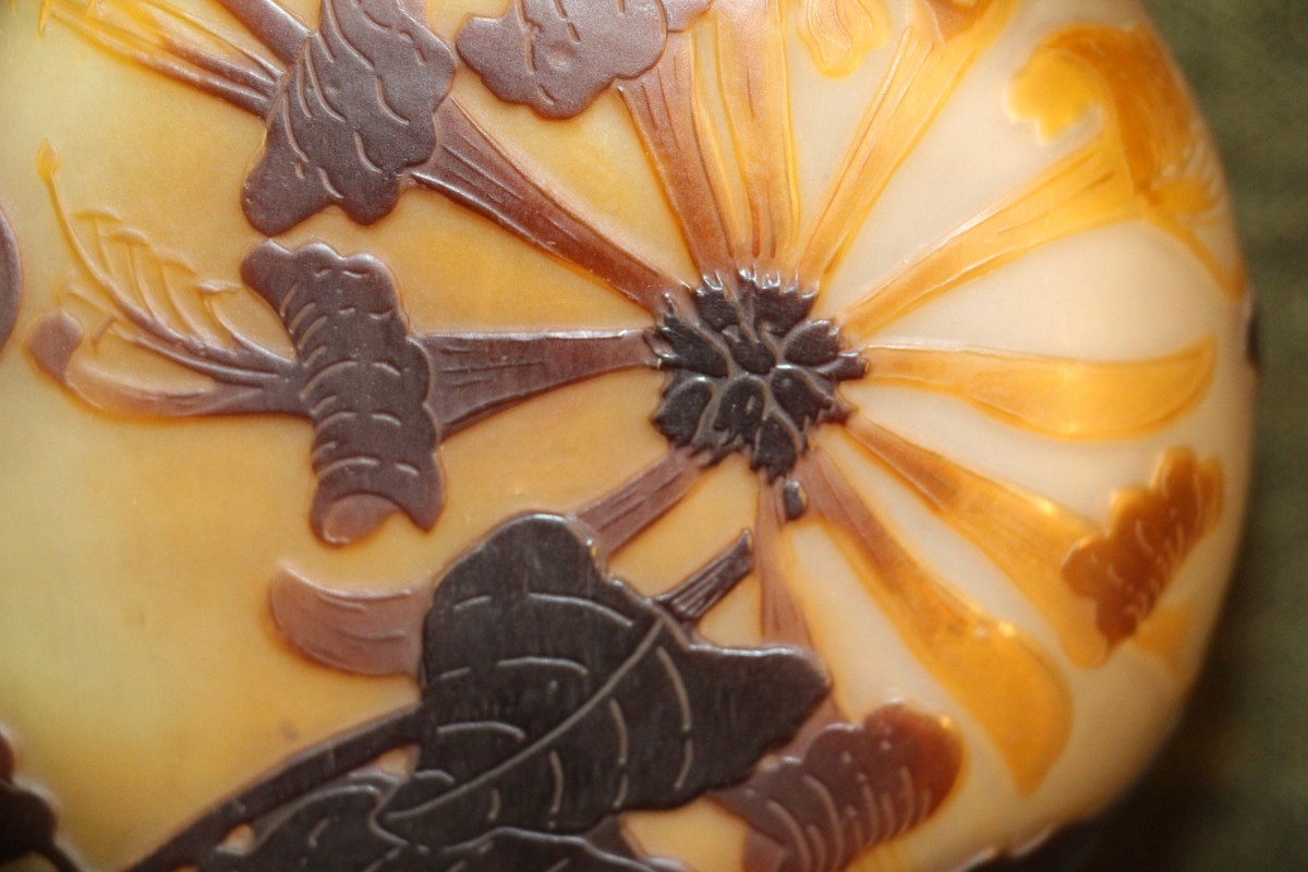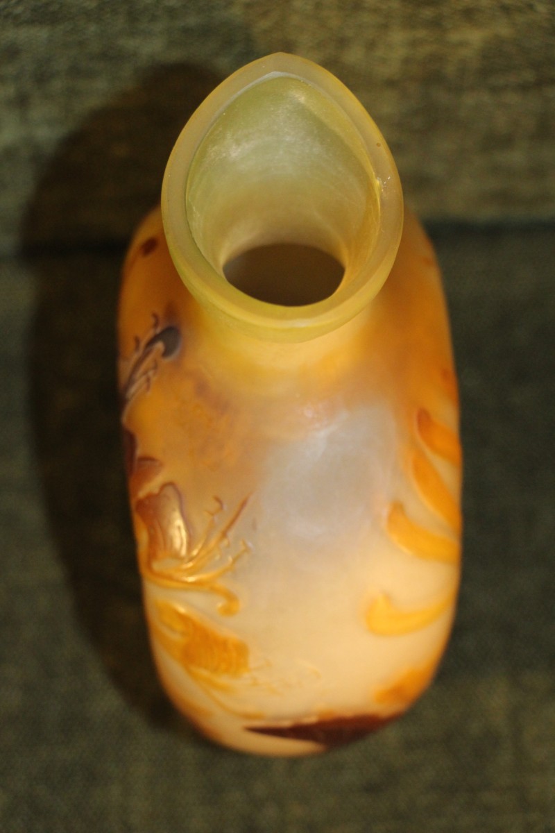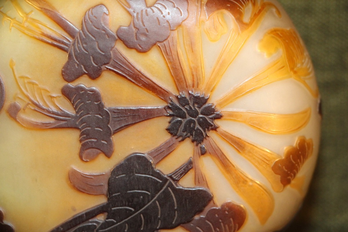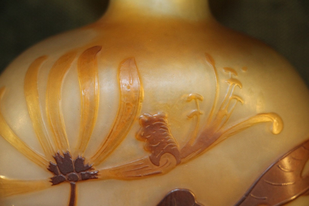Beau et rare vase de forme gourde en pâte de verre à décor dégagé à l'acide de motifs de fleurs de lys sauvages sur fond opaque.