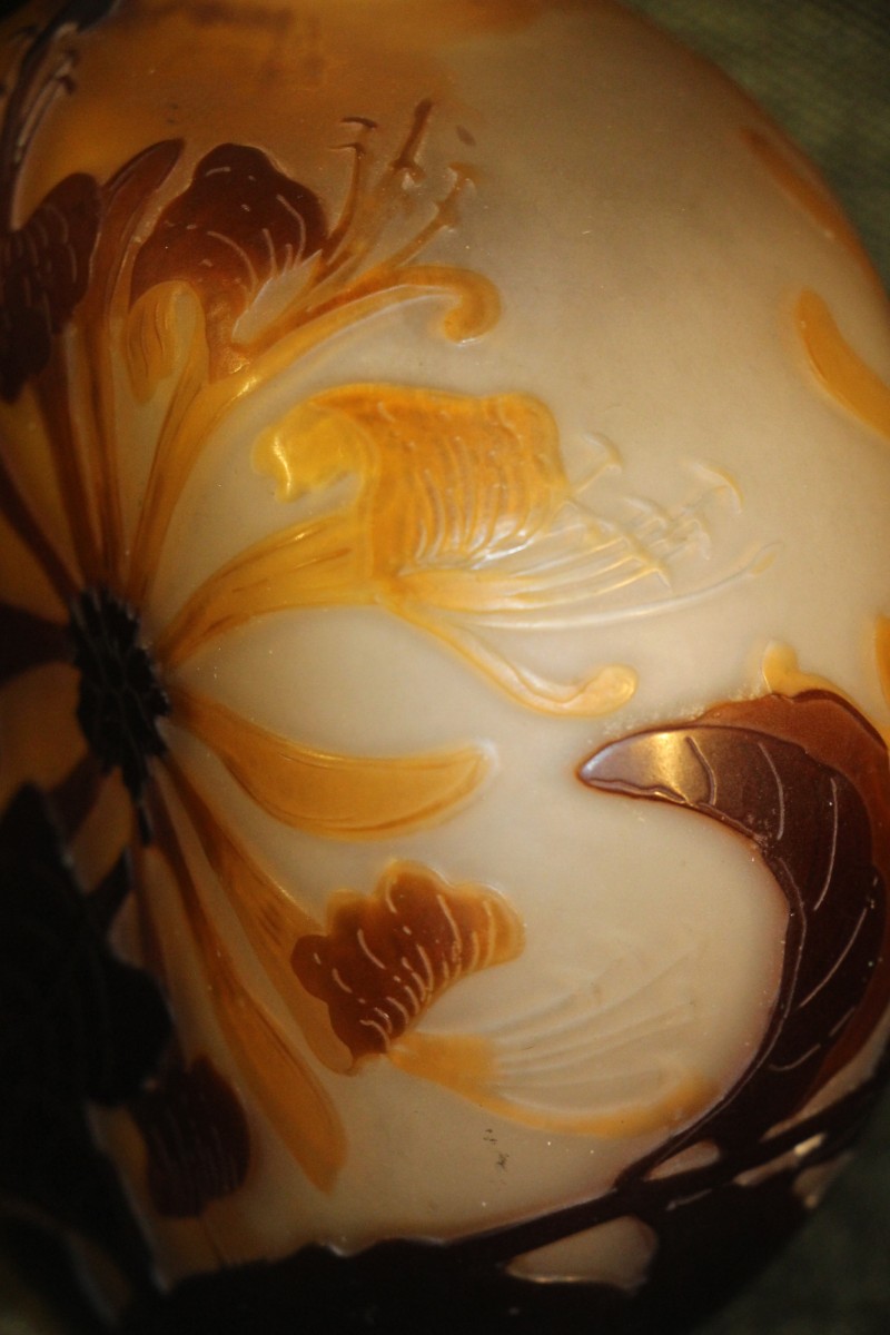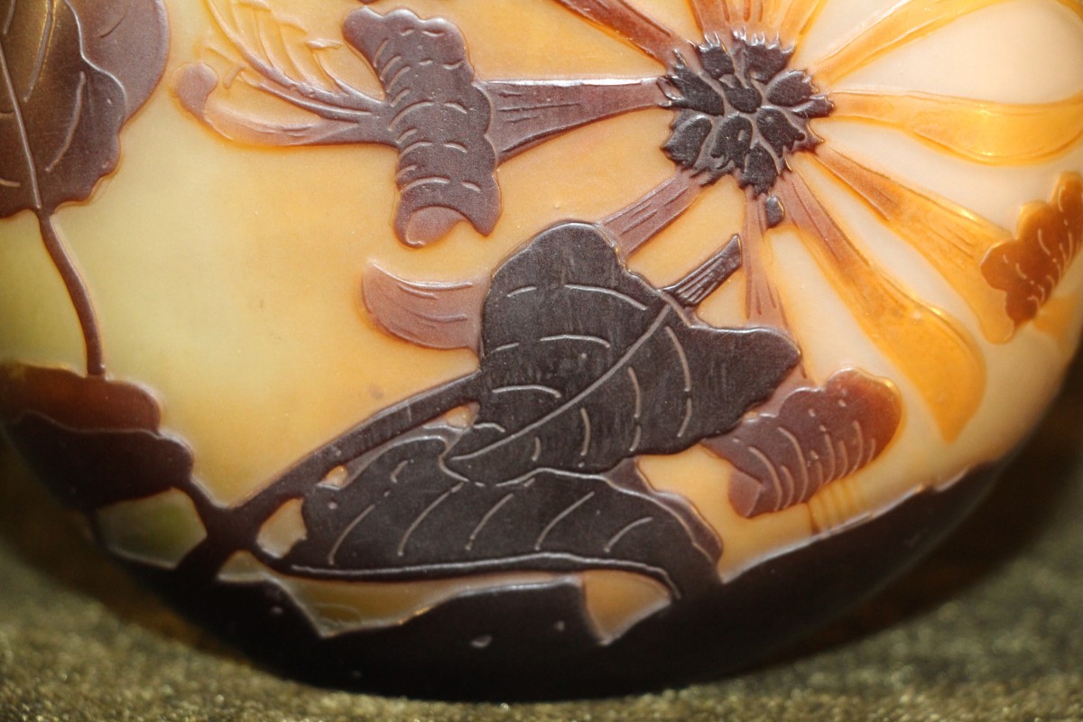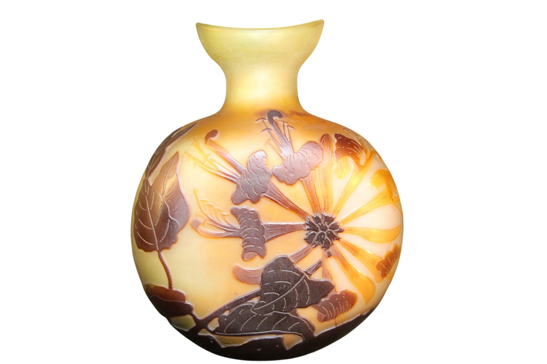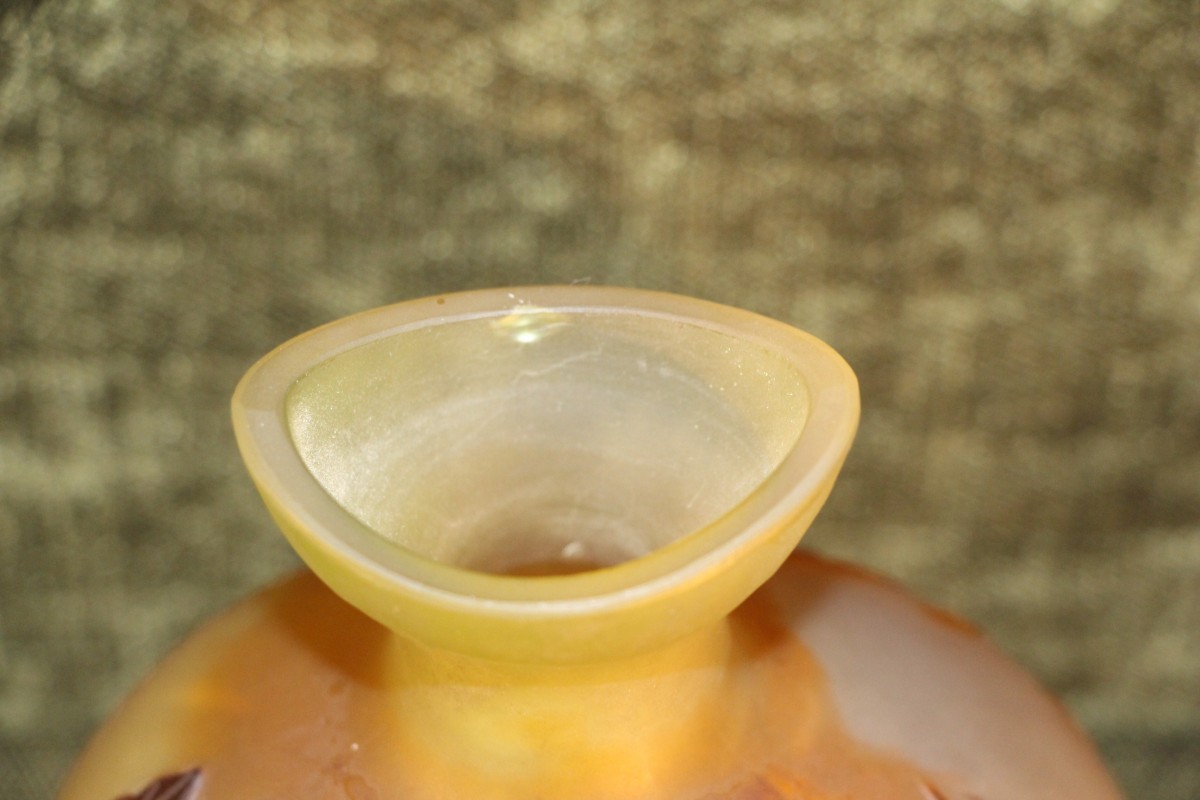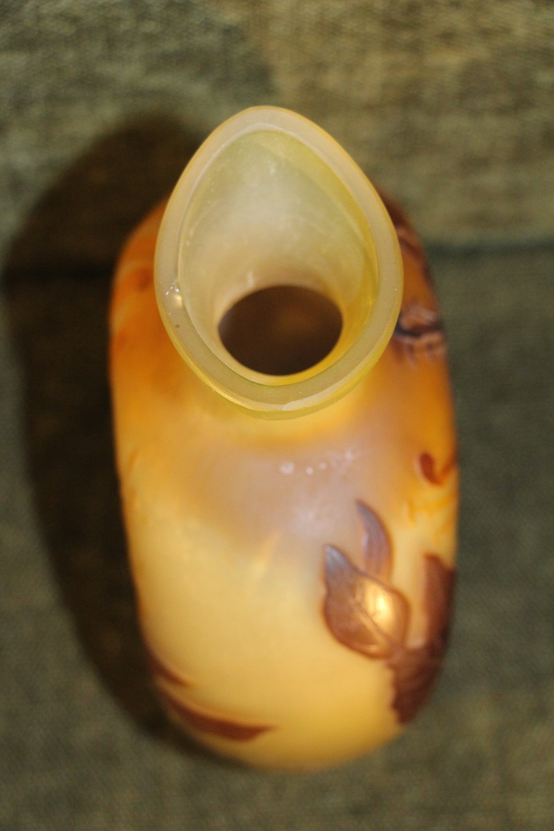 Beau et rare vase de forme gourde en pâte de verre à décor dégagé à l'acide de motifs de fleurs de lys sauvages sur fond opaque.