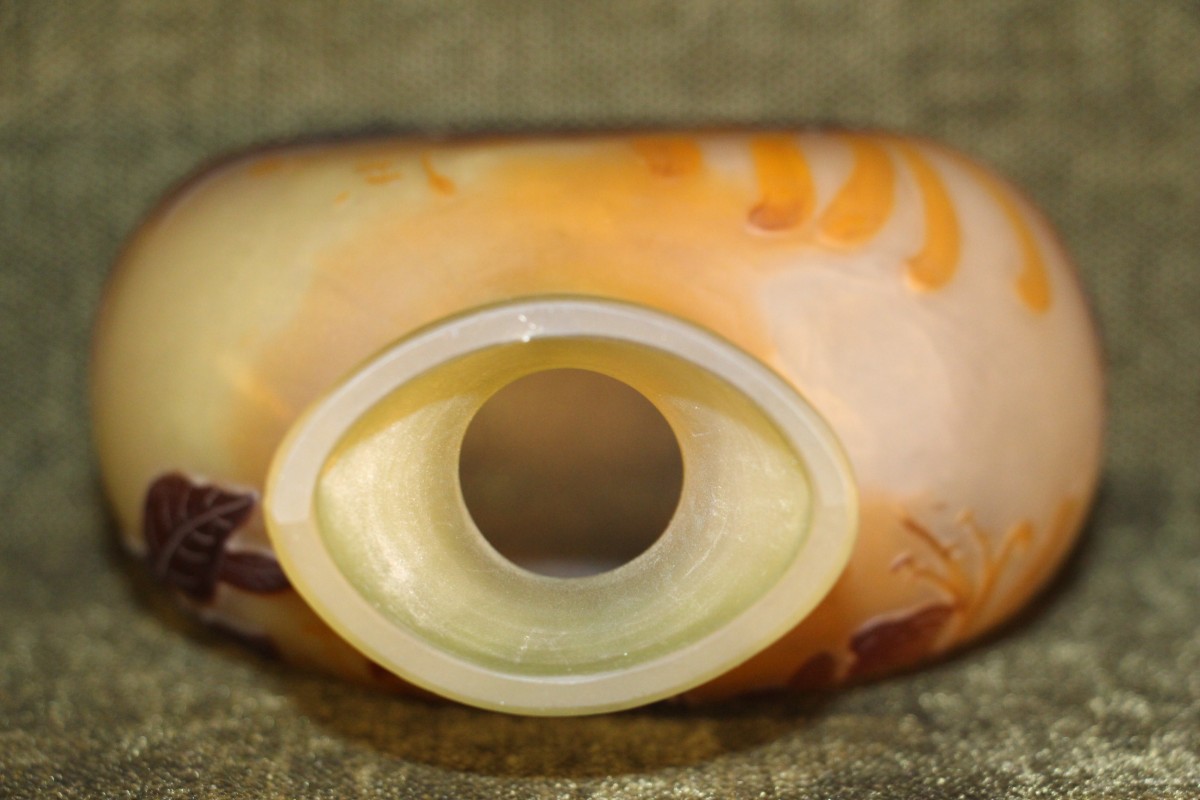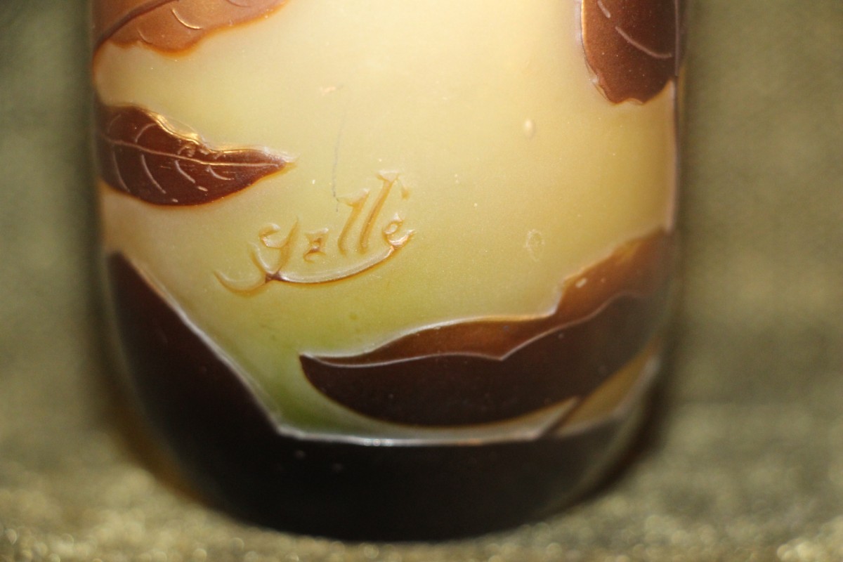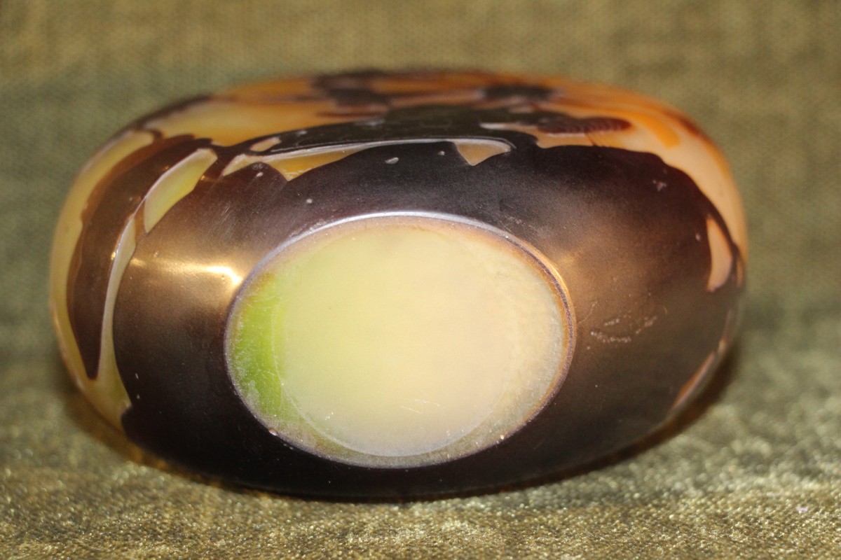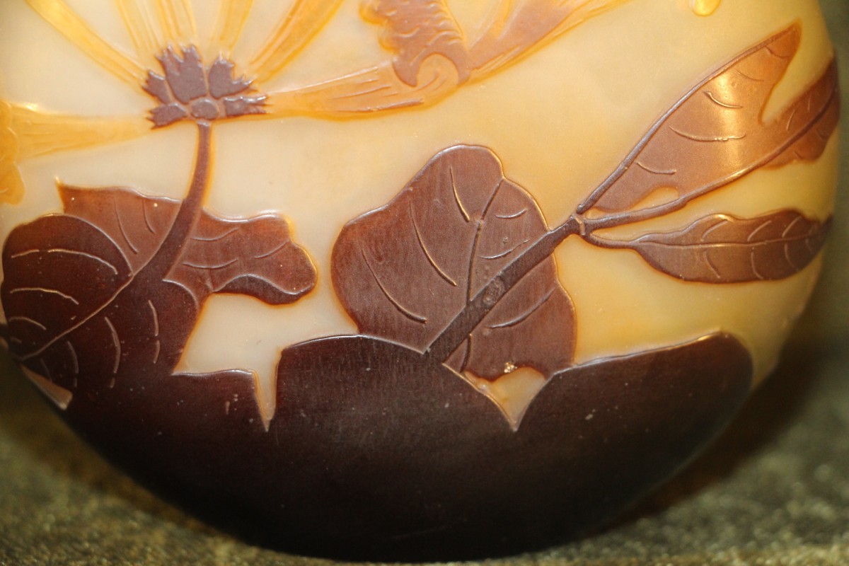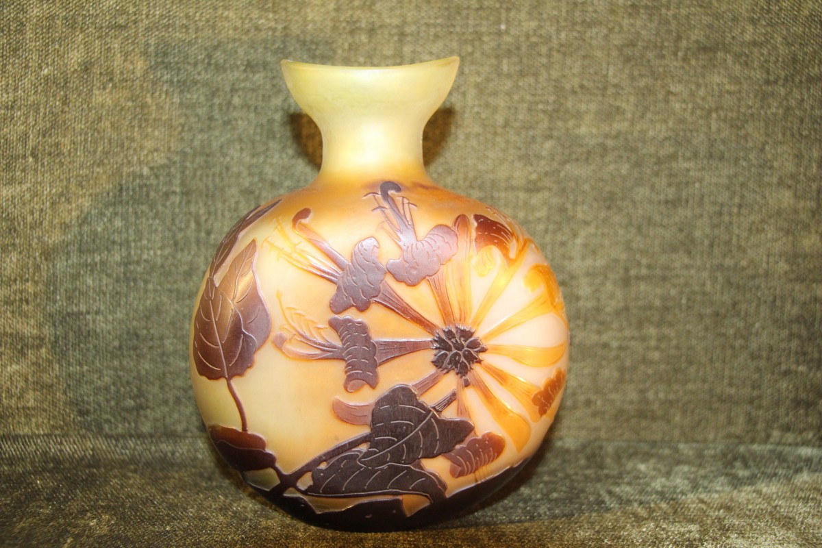 Beau et rare vase de forme gourde en pâte de verre à décor dégagé à l'acide de motifs de fleurs de lys sauvages sur fond opaque.