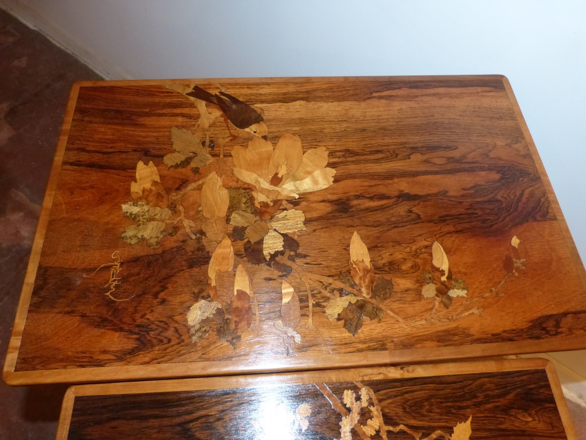 Retrouver le mobilier ou les objets d''art similaires à « Emile Gallé - belle série de tables gigognes aux quatre saisons » présenté par Galerie Vaudemont, antiquaire à Nancy dans la catégorie Table & Guéridon Art nouveau, Mobilier.