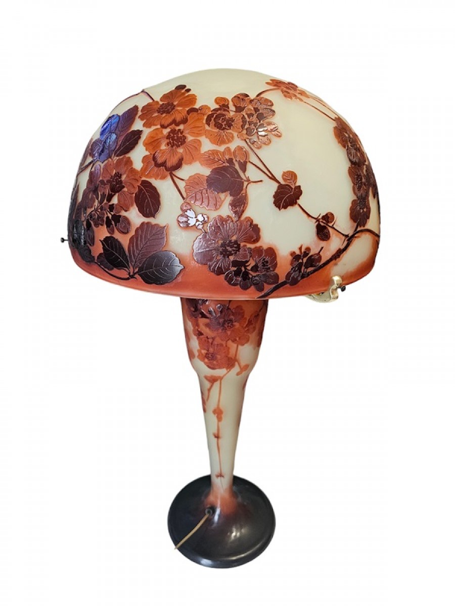 Retrouver le mobilier ou les objets d''art similaires à « Emile Gallé - Grande Lampe Champignon Art Nouveau "Fleurs de cerisier du Japon" » présenté par Antiquités Art Nouveau, antiquaire à Nancy dans la catégorie Lampe Art nouveau, Luminaires.