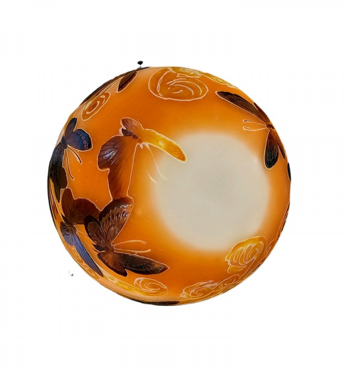 Superbe décor gravé en fines réserves à l'acide et partiellement poli, de papillons en volent, de feuillages stylisés et de tulipes, sur un fond opacifié et nuancé de blanc, d'orange et de rose.