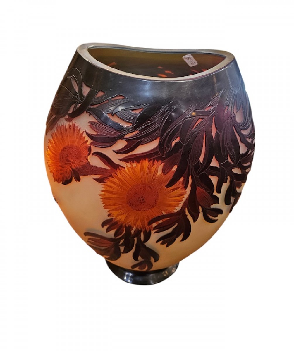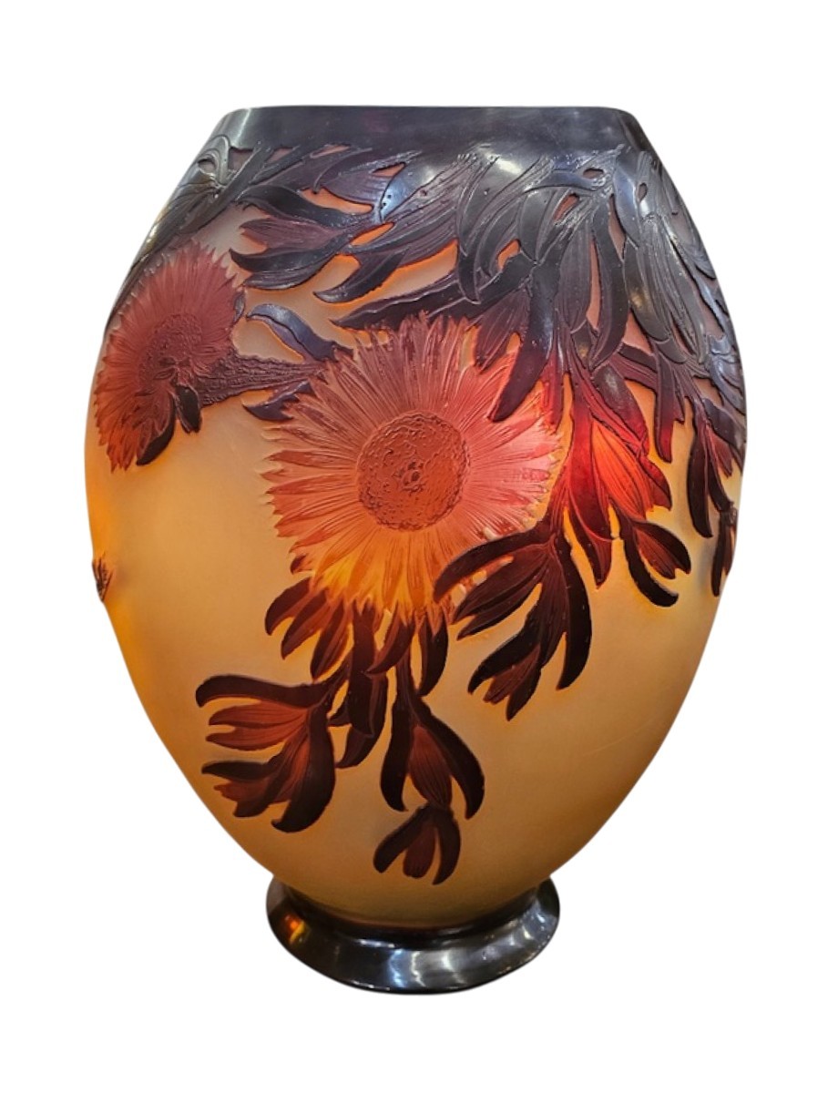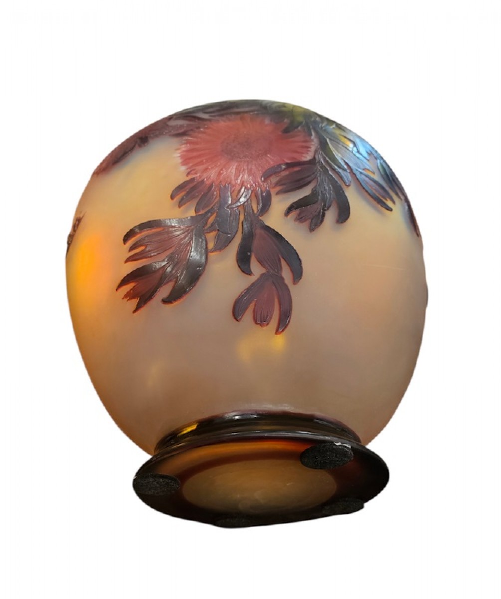 Spectaculaire vase ovoïde à panse méplate et col navette sur piédouche en verre triple. Magnifique décor gravé en très fines réserves à l'acide et repris à la roue, de feuillages et de fleurs de ficoïdes marins rouges sur un fond jaune satiné. Le décor est repris en gravure par l'intérieur du vase pour offrir une luminosité parfaite au niveau des décors floraux, nous possédons le modèle aux fleurs bleues. Remarquable rendu lumineux et superbe qualité de gravure!