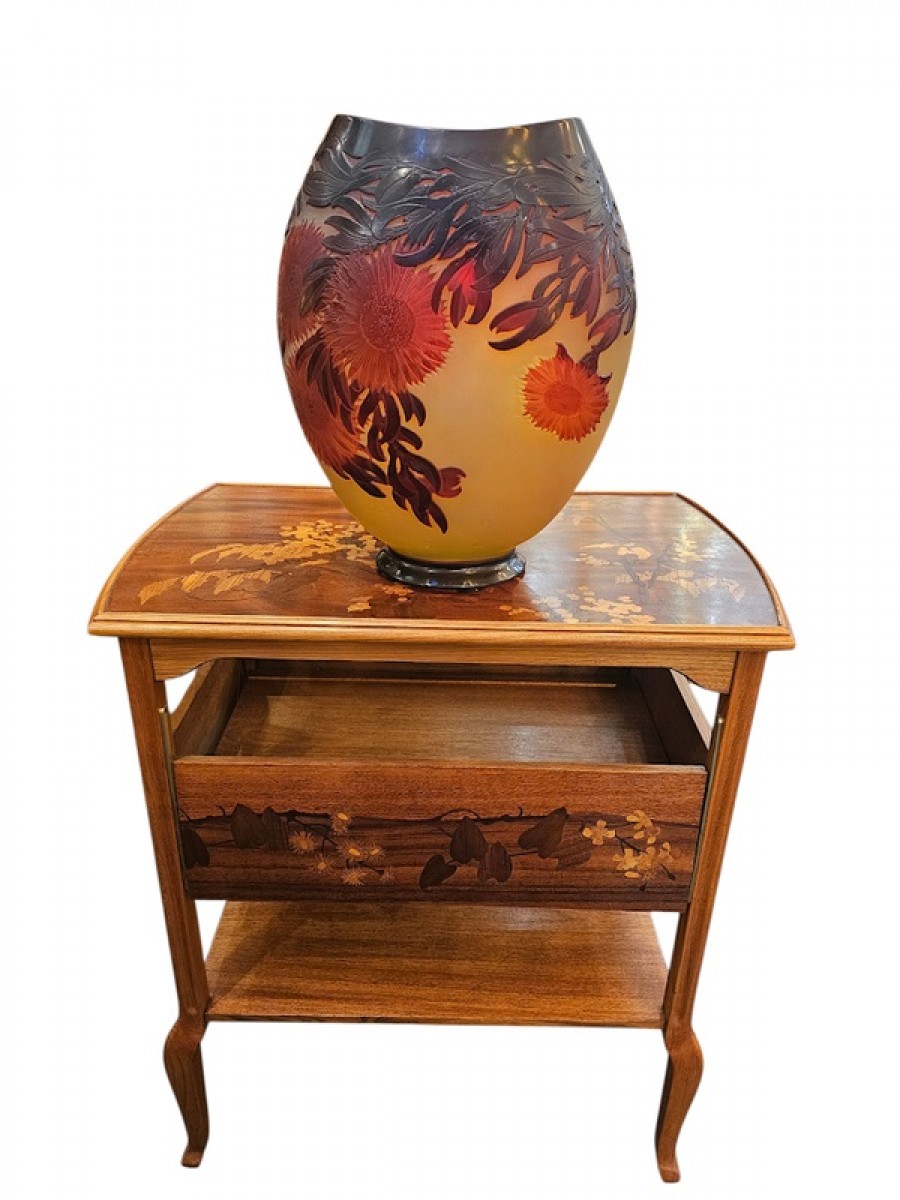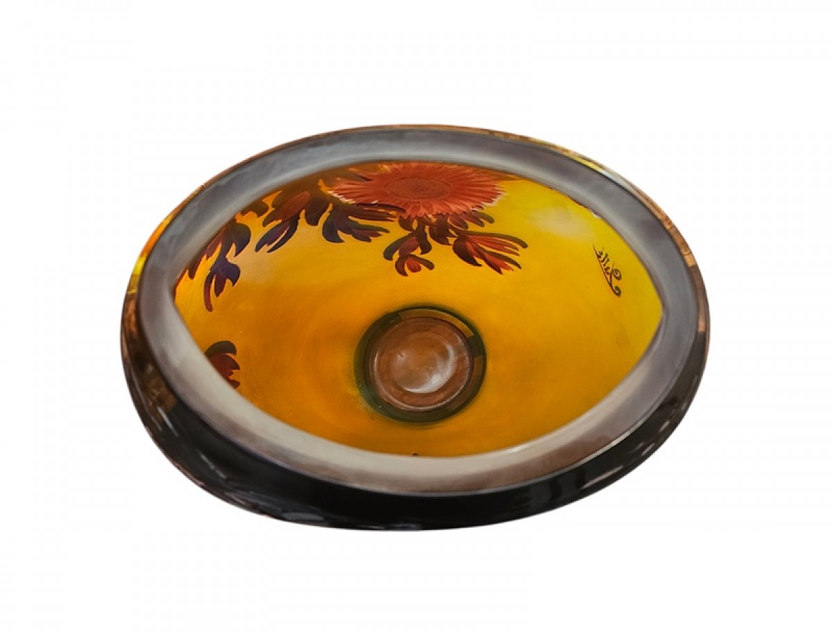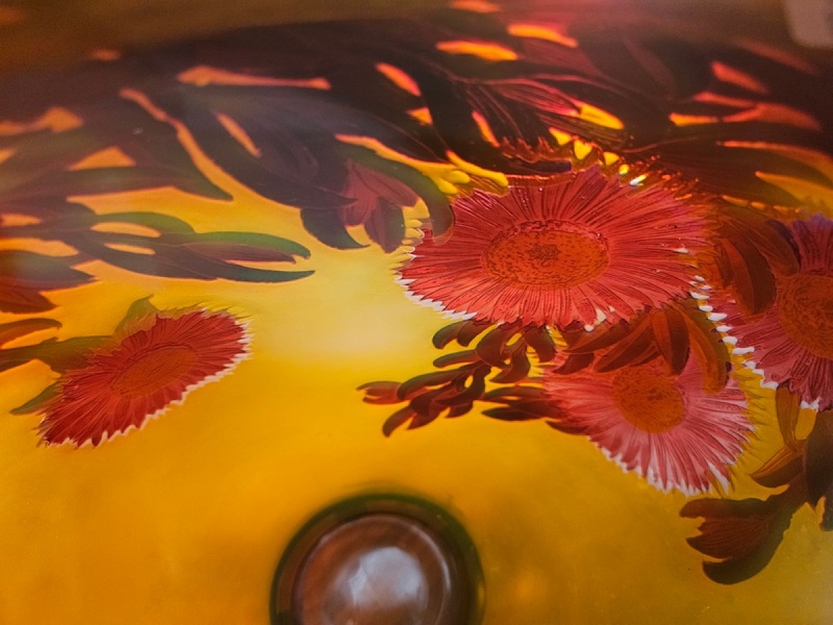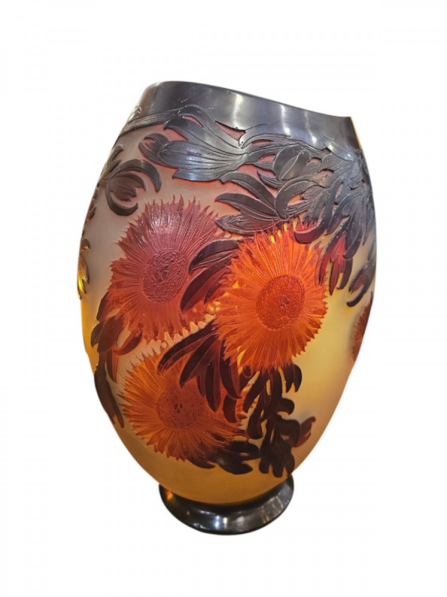 Spectaculaire vase ovoïde à panse méplate et col navette sur piédouche en verre triple. Magnifique décor gravé en très fines réserves à l'acide et repris à la roue, de feuillages et de fleurs de ficoïdes marins rouges sur un fond jaune satiné. Le décor est repris en gravure par l'intérieur du vase pour offrir une luminosité parfaite au niveau des décors floraux, nous possédons le modèle aux fleurs bleues. Remarquable rendu lumineux et superbe qualité de gravure!