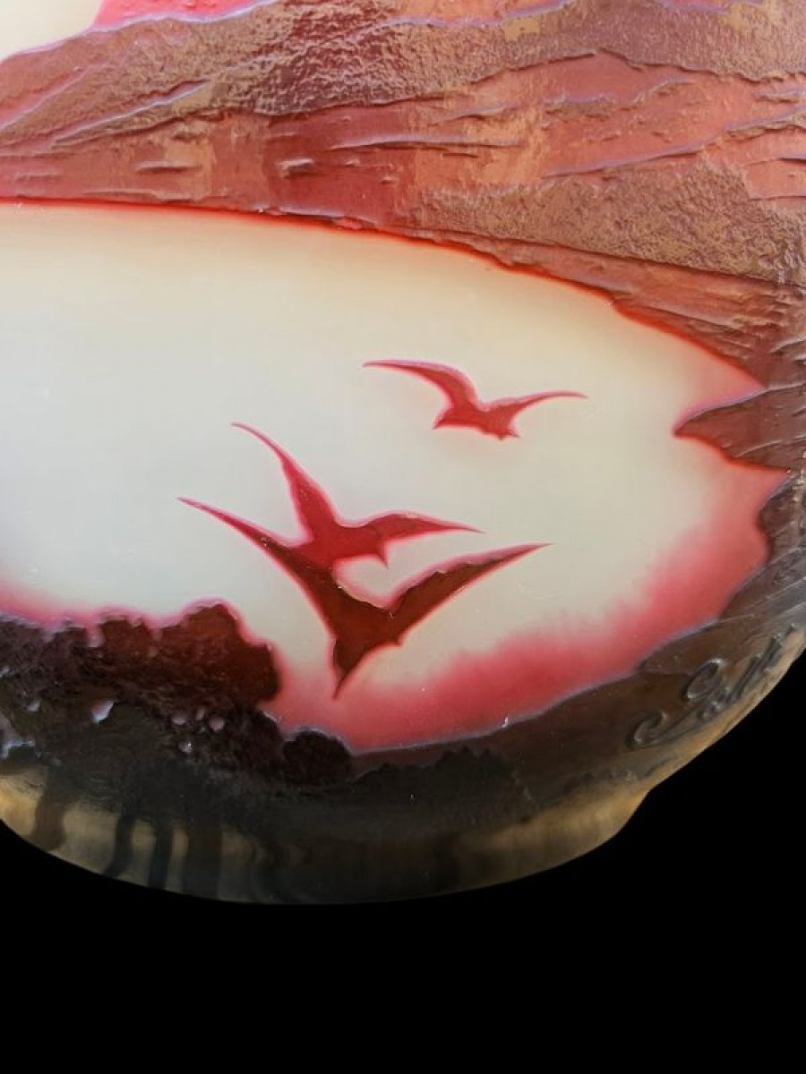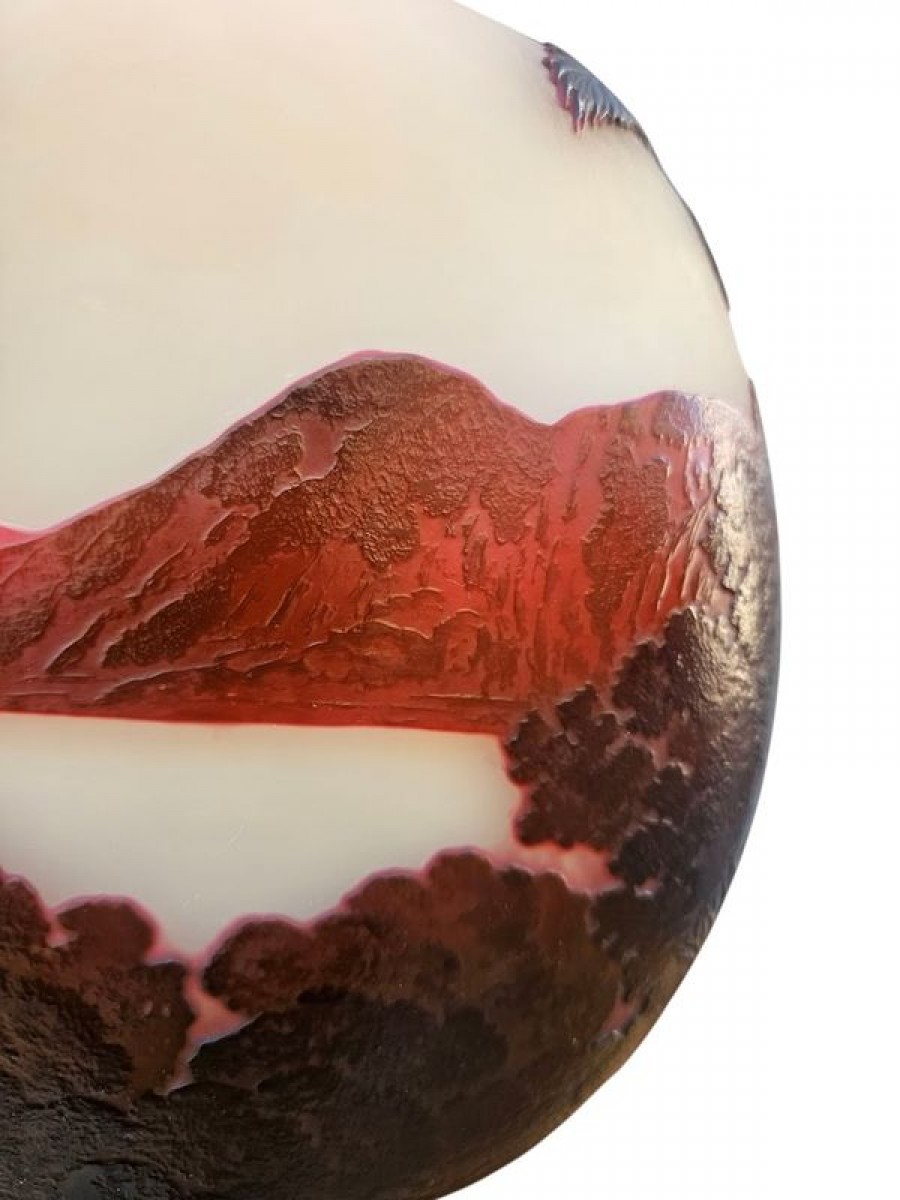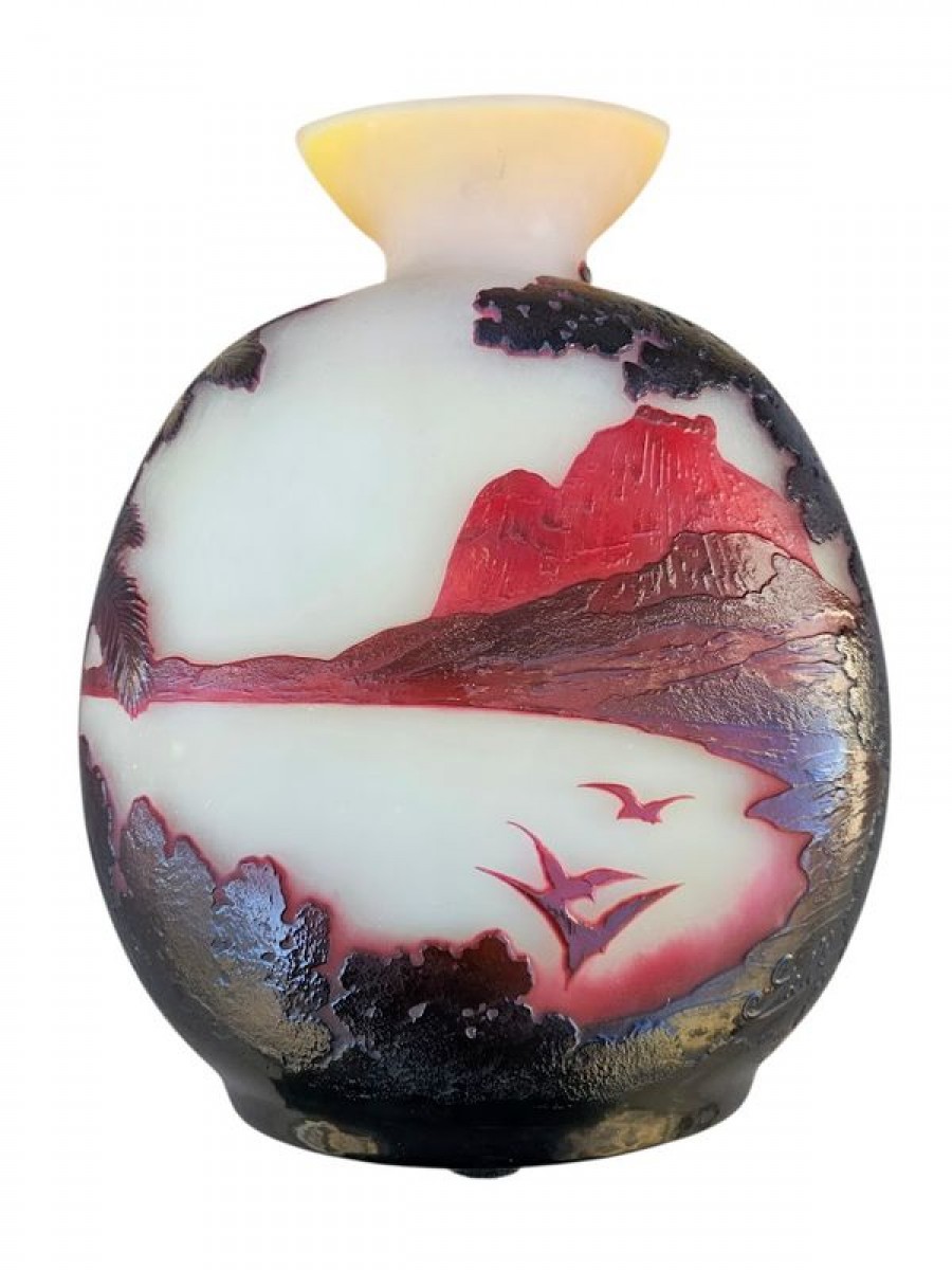 Spectaculaire vase en verre triple de forme circulaire à panse méplate épaulée et col navette. Rare et magnifique décor gravé en profondes réserves à l'acide d'arbres violets au premier plan, d'une vue panoramique de la Baie de Rio animée d'oiseaux en nuances de pourpre sur un fond opacifié blanc orangé. Superbe rendu lumineux! Les décors exotiques sont très rares dans la production des vases à camée des établissements Gallé, les vues de Rio se limitent à une demi-douzaine de décors différents pour une production estimée de 200 vases.