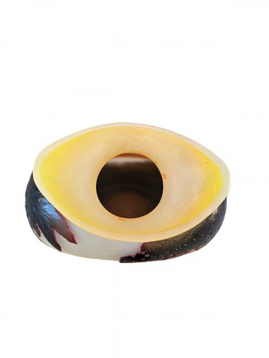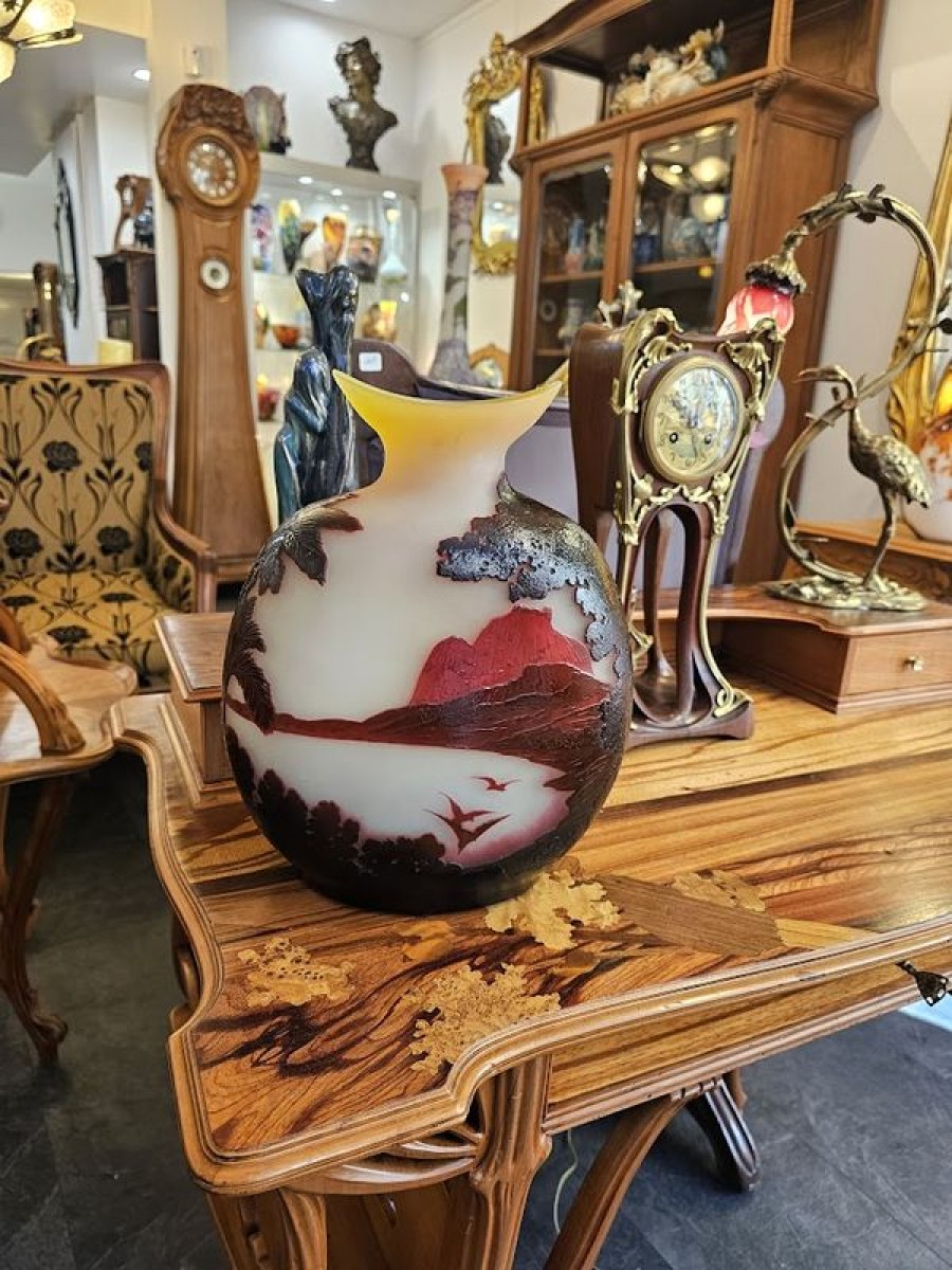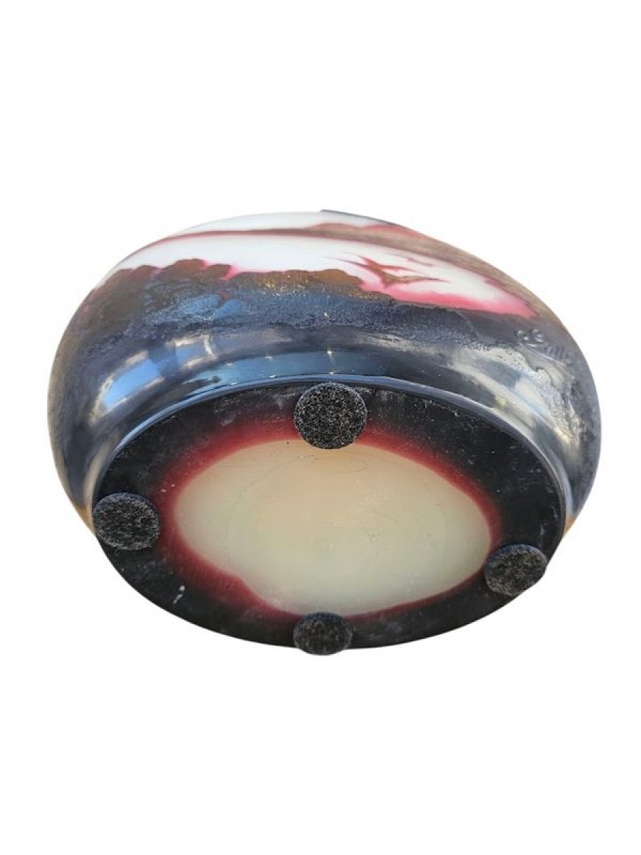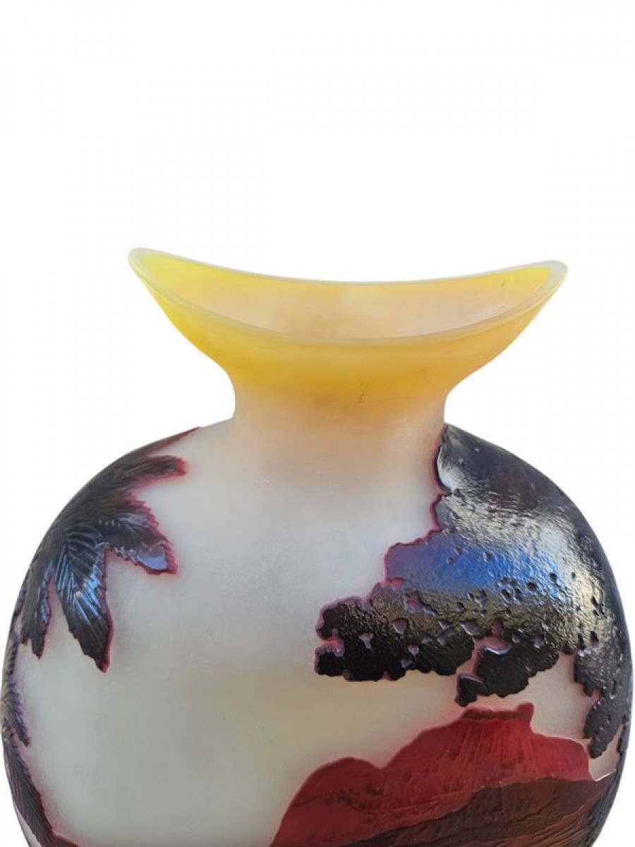 Spectaculaire vase en verre triple de forme circulaire à panse méplate épaulée et col navette. Rare et magnifique décor gravé en profondes réserves à l'acide d'arbres violets au premier plan, d'une vue panoramique de la Baie de Rio animée d'oiseaux en nuances de pourpre sur un fond opacifié blanc orangé. Superbe rendu lumineux! Les décors exotiques sont très rares dans la production des vases à camée des établissements Gallé, les vues de Rio se limitent à une demi-douzaine de décors différents pour une production estimée de 200 vases.