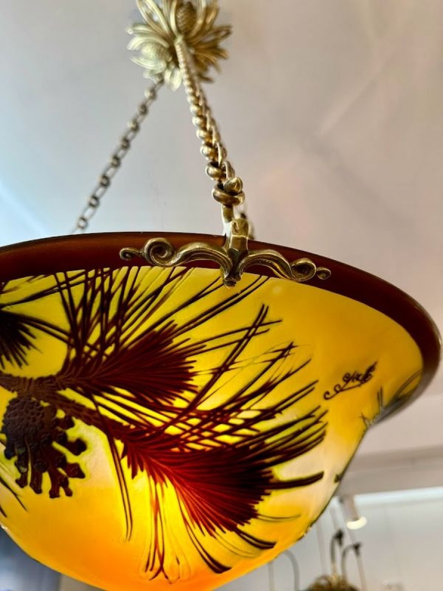 Retrouver le mobilier ou les objets d''art similaires à « Emile Gallé - Plafonnier Art nouveau "Pommes de Pin" » présenté par Antiquités Art Nouveau, antiquaire à Nancy dans la catégorie Lustre Art nouveau, Luminaires.