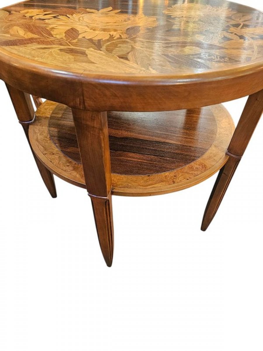 Superbe table basse circulaire à double plateau en érable massif mouluré. Elle repose sur cinq pieds effilés à la base, le plateau supérieur présente un décor finement marqueté de pivoines sur fond d'ébène de Macassar, le second une partie centrale en palissandre cernée de filés d'ébène et de loupe d'orme. Très belle finition cirée!