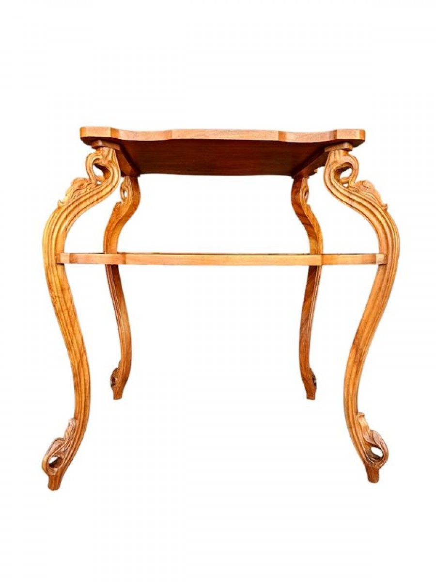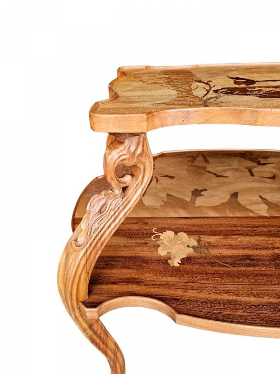 Spectaculaire table à thé en noyer massif mouluré, nervuré et sculpté. Elle présente deux plateaux à découpes chantournées munis d'alèses débordantes, le premier est marqueté de deux vases, d'un papillon et d'œillets, le second présente un décor d'iris et de feuillages. (Essences de frêne, noyer, palissandre, érable, tamo, poirier) Elle repose sur quatre montants profondément galbés, nervurés, ajourés et finement sculptés de feuillages. Très rare modèle présent dans les collections du musée d'Orsay, exceptionnelle qualité de marqueterie et de sculpture!