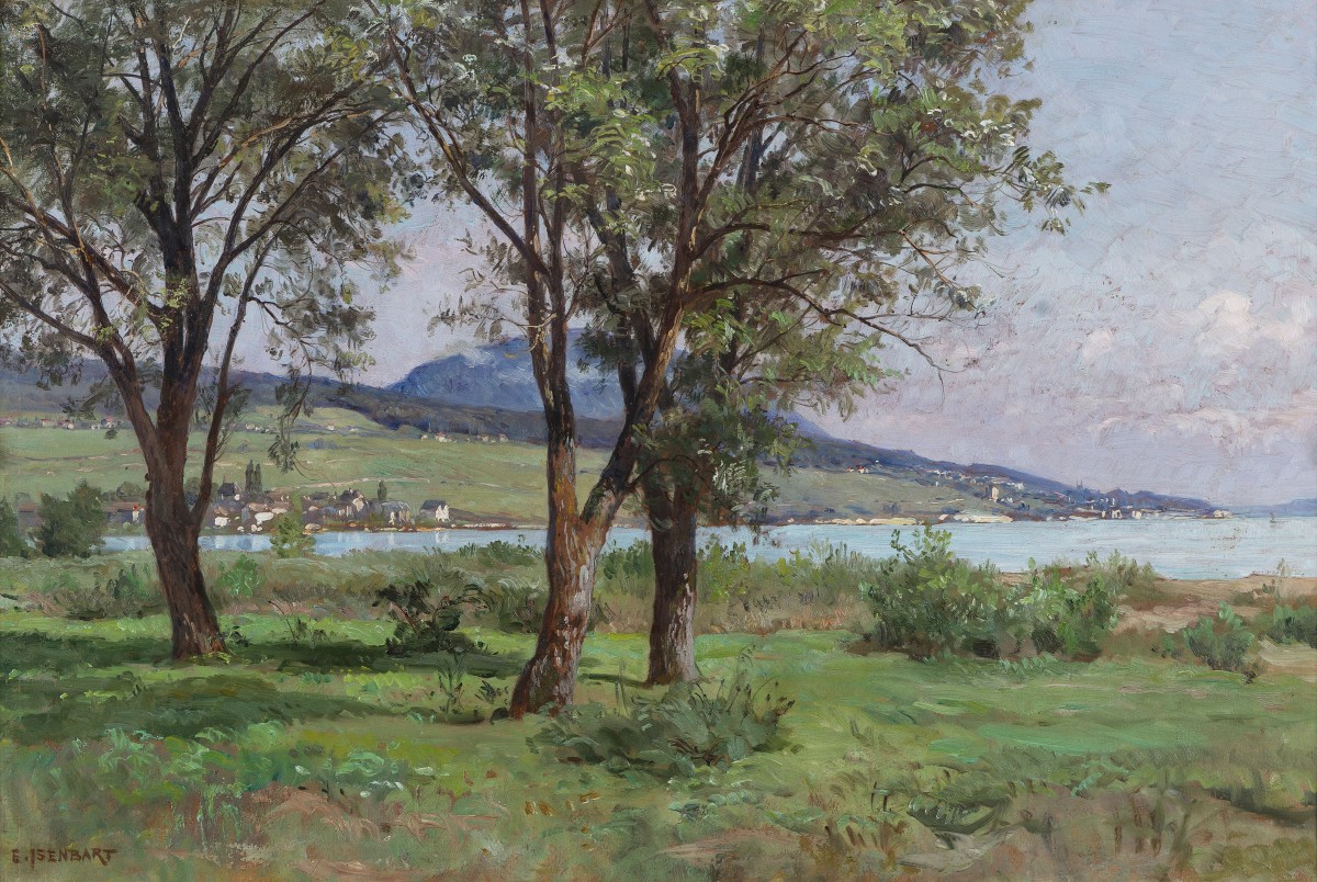 Si les représentations du Jura français sont très nombreuses chez ce peintre, cette vue du Jura Suisse est particulièrement rare. La composition est intelligente, avec une percée à droite qui ouvre la perspective et laisse voir la rive opposée, ou les maisons sont traitées avec d’habiles petites touches. Comme à son habitude, Isenbart utilise dans cette œuvre une infinité de nuances de vert. Isenbart nous offre, ici encore, une vision de la nature tranquille et reposante, dans laquelle l’agitation humaine est presque absente.