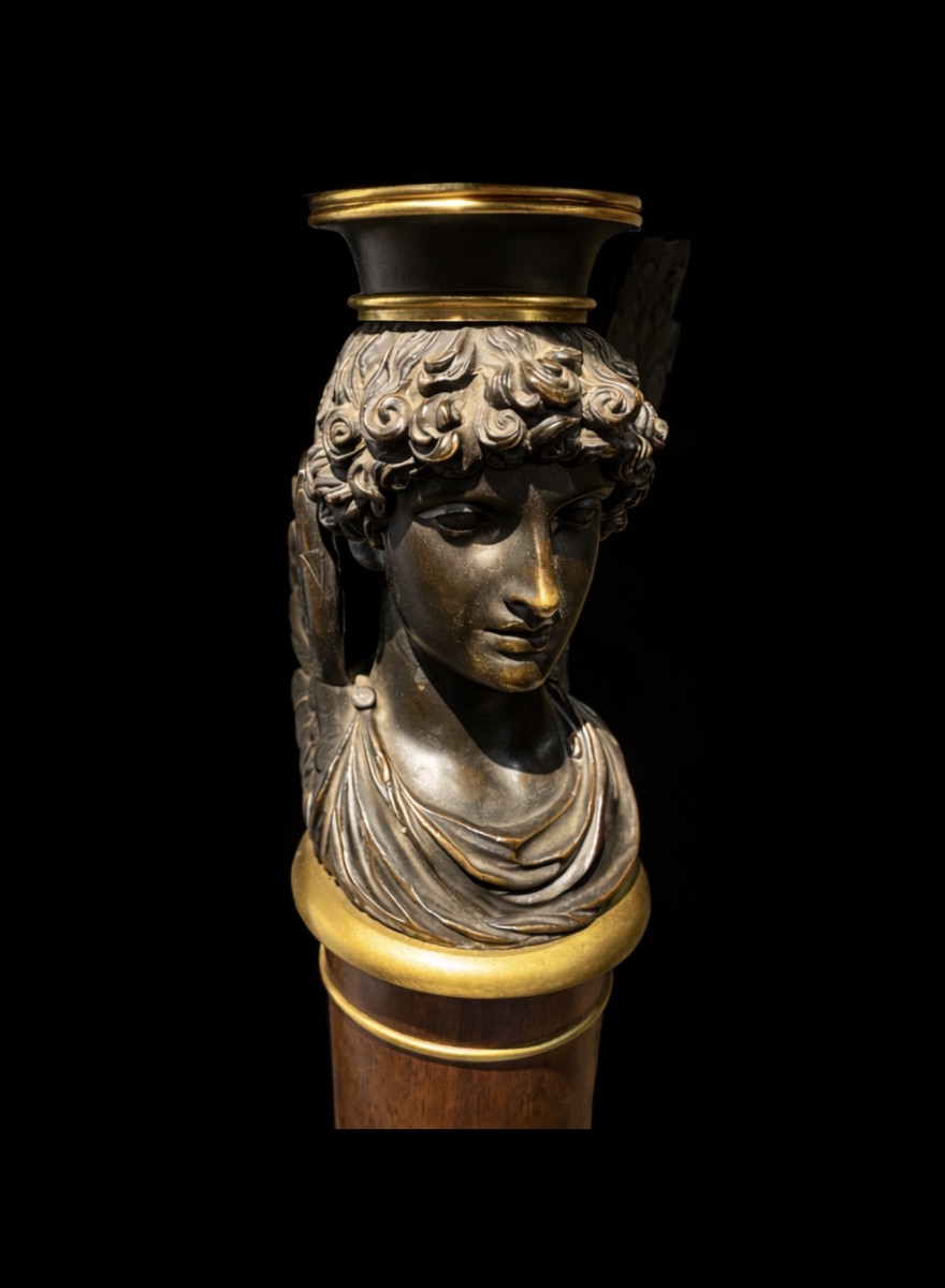 Les bronzes, d’une qualité d’exécution remarquable, se distinguent par la finesse de leur ciselure et l’élégance de leur patine. Le traitement des têtes de Zéphyr, d’un modelé précis et expressif, traduit un travail d’atelier ...