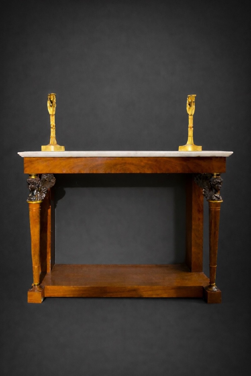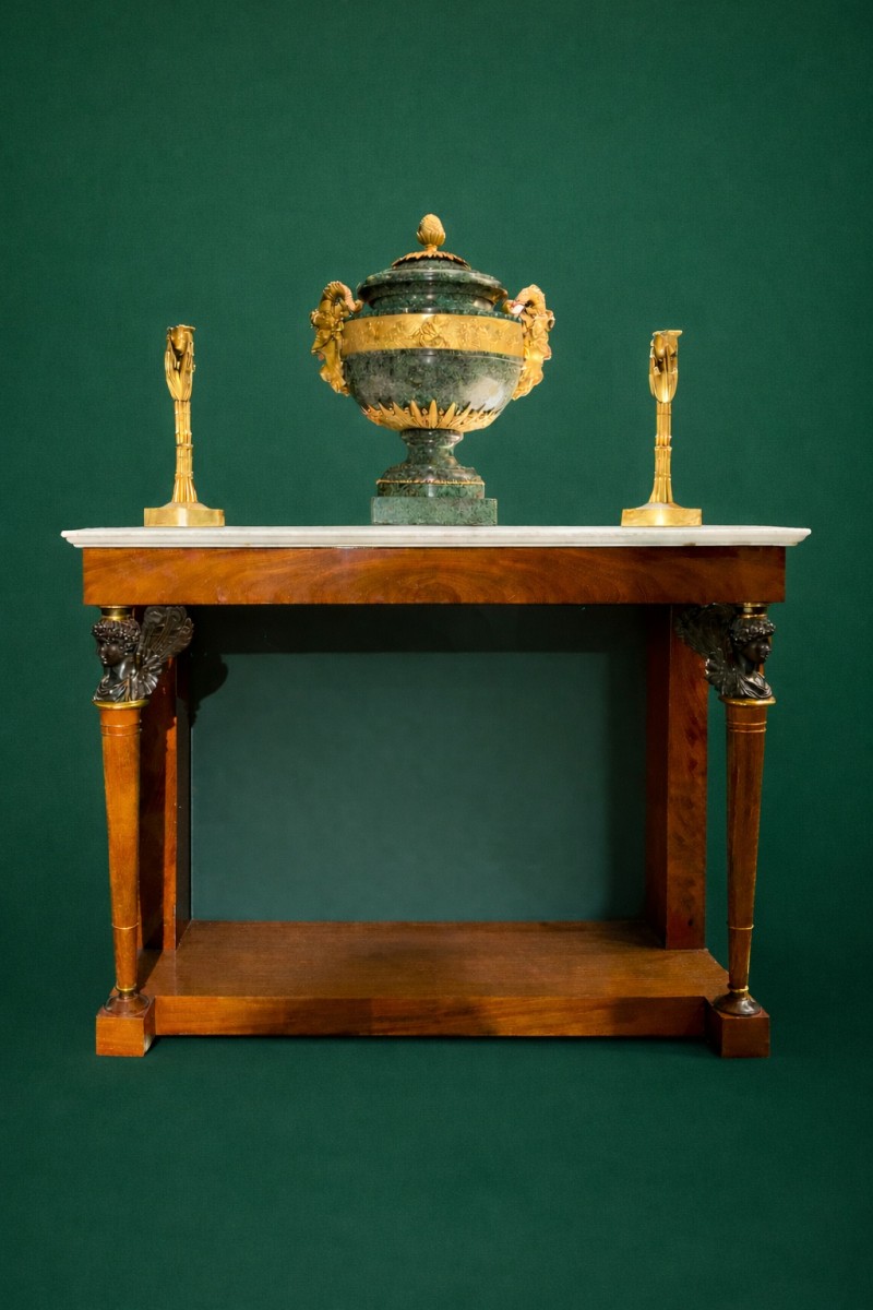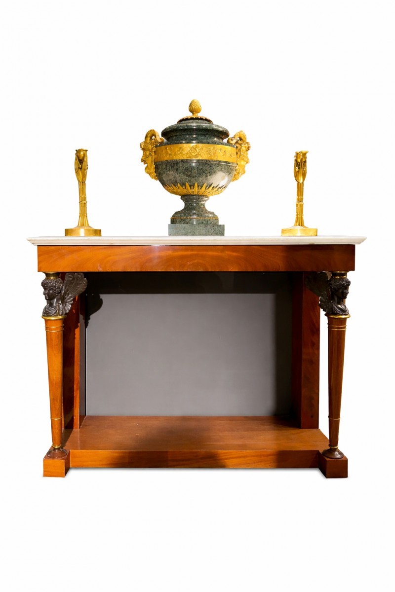 Bien que non signée, la console proposée se distingue par la qualité exceptionnelle de sa construction, l’emploi d’un acajou de Cuba de premier choix et la finesse de ses bronzes, la situant dans la sphère des grandes productions Empire du début du XIX? siècle.