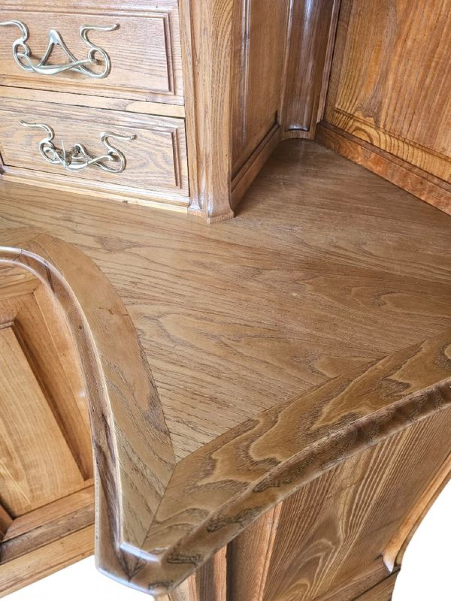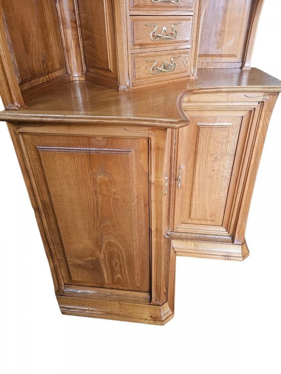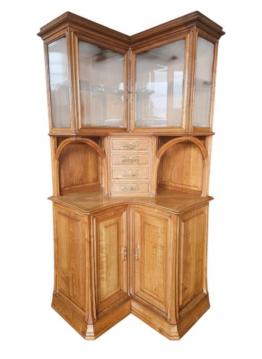 Superbe encoignure en frêne massif mouluré et sculpté. La partie basse présente des montants galbés et ouvre par deux portes pleines, la partie centrale présente un caisson à quatre tiroirs et des montants en arcatures, la partie haute en porte-à-faux est vitrée toutes faces et ouvre par deux portes. Vitres biseautées, panneaux à plate-bande, entrées de serrures et poignées en bronze doré. Remarquable qualité d'ébénisterie et très belle finition cirée.
