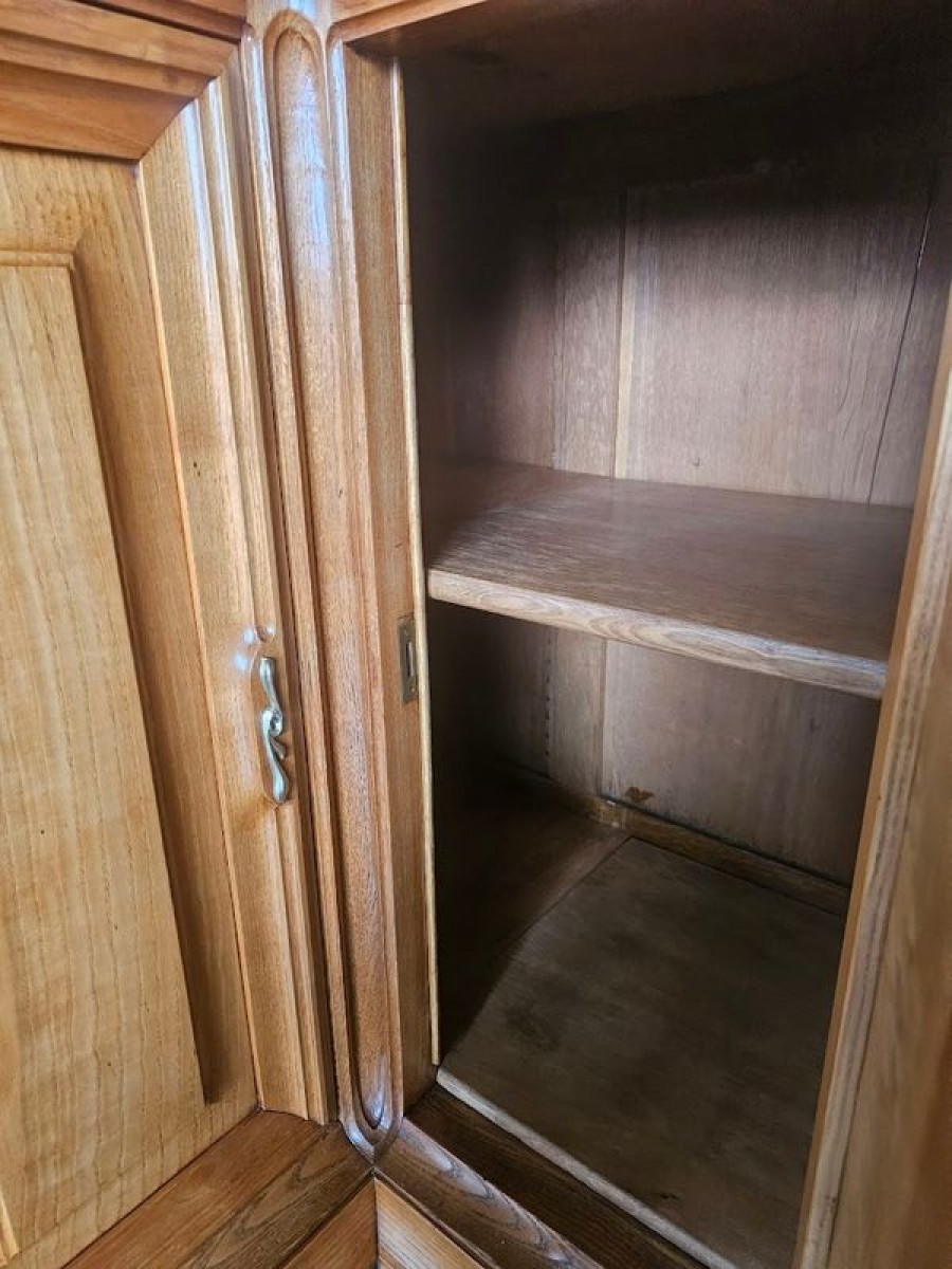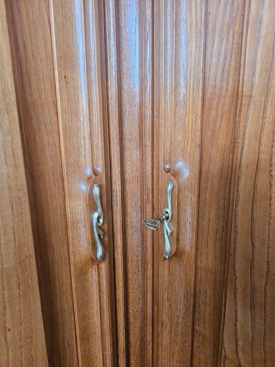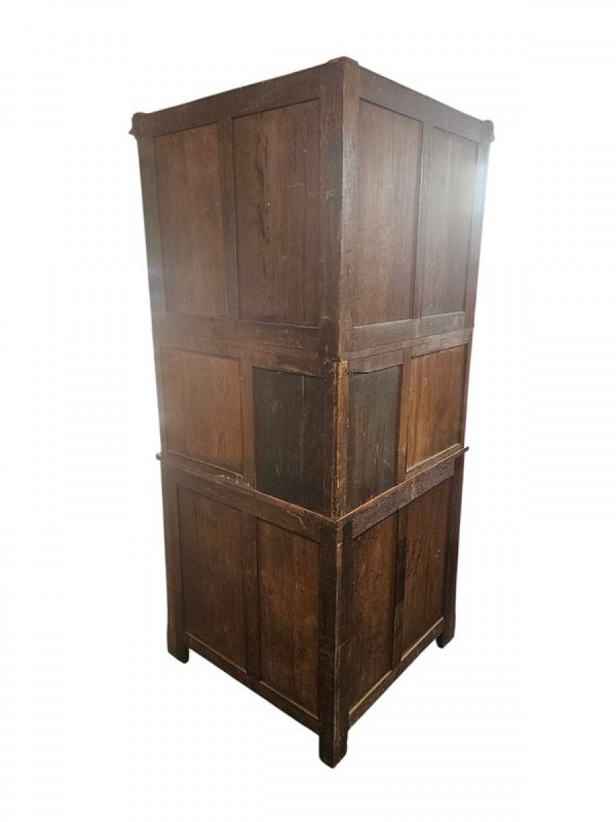 Superbe encoignure en frêne massif mouluré et sculpté. La partie basse présente des montants galbés et ouvre par deux portes pleines, la partie centrale présente un caisson à quatre tiroirs et des montants en arcatures, la partie haute en porte-à-faux est vitrée toutes faces et ouvre par deux portes. Vitres biseautées, panneaux à plate-bande, entrées de serrures et poignées en bronze doré. Remarquable qualité d'ébénisterie et très belle finition cirée.