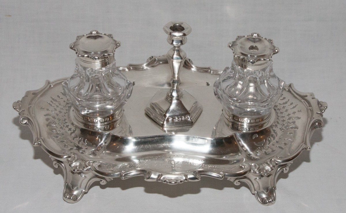 Les encriers, le porte plume et la base portent les mêmes poinçons