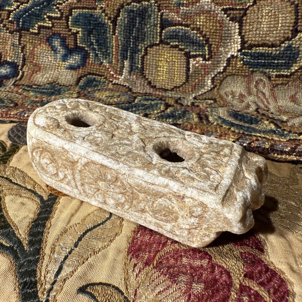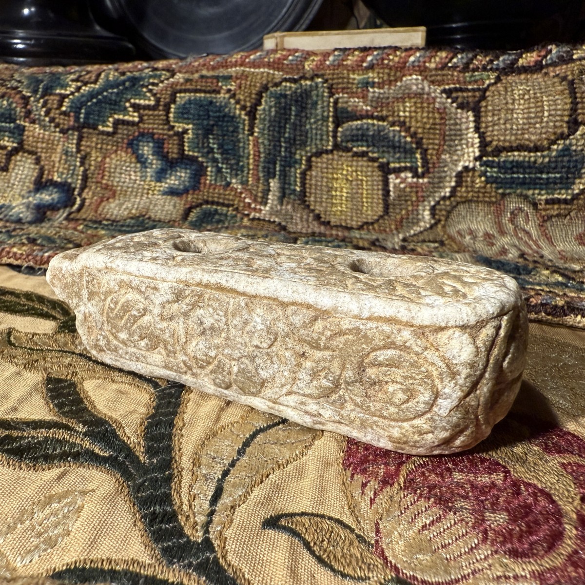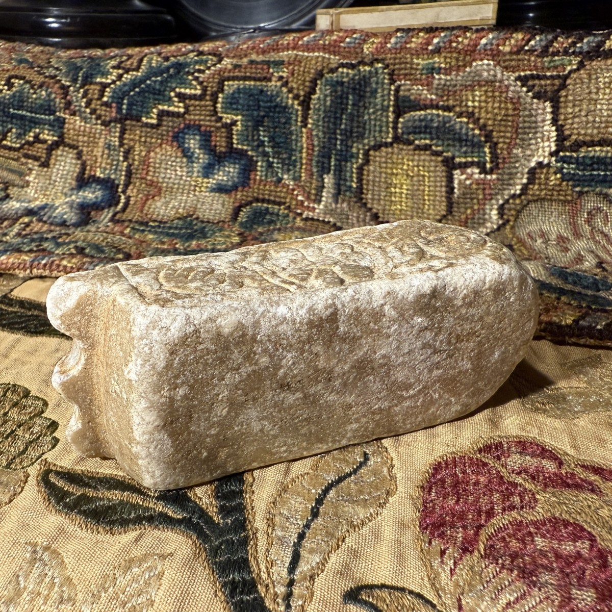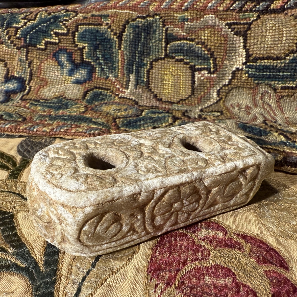 Cet encrier double compact est sculpté dans du marbre. Sa surface présente une patine légèrement usée, témoignant d'une longue utilisation. Le corps oblong est finement travaillé, l'une de ses extrémités courtes se terminant par une légère échancrure festonnée. La face supérieure comporte deux compartiments cylindriques verticaux à encre, dont les bords sont subtilement chanfreinés par l'usure. Autour des réservoirs se trouve un panneau sculpté en bas-relief, composé de motifs végétaux enroulés et de vrilles entrelacées, inscrit dans un étroit cadre en retrait. Les côtés présentent un décor en relief similaire, alternant rosettes et volutes, tandis que les faces inférieures arborent de grands motifs floraux stylisés.