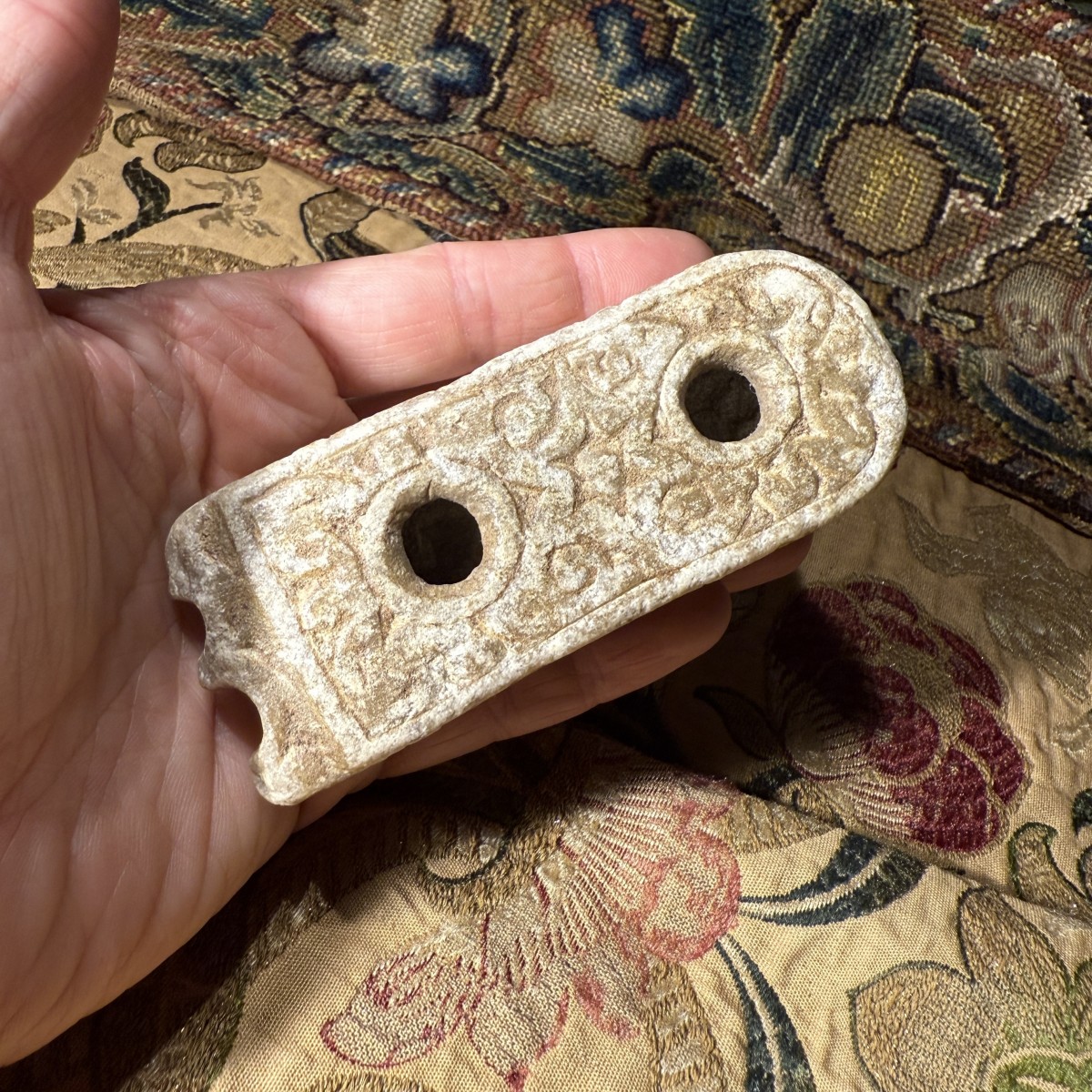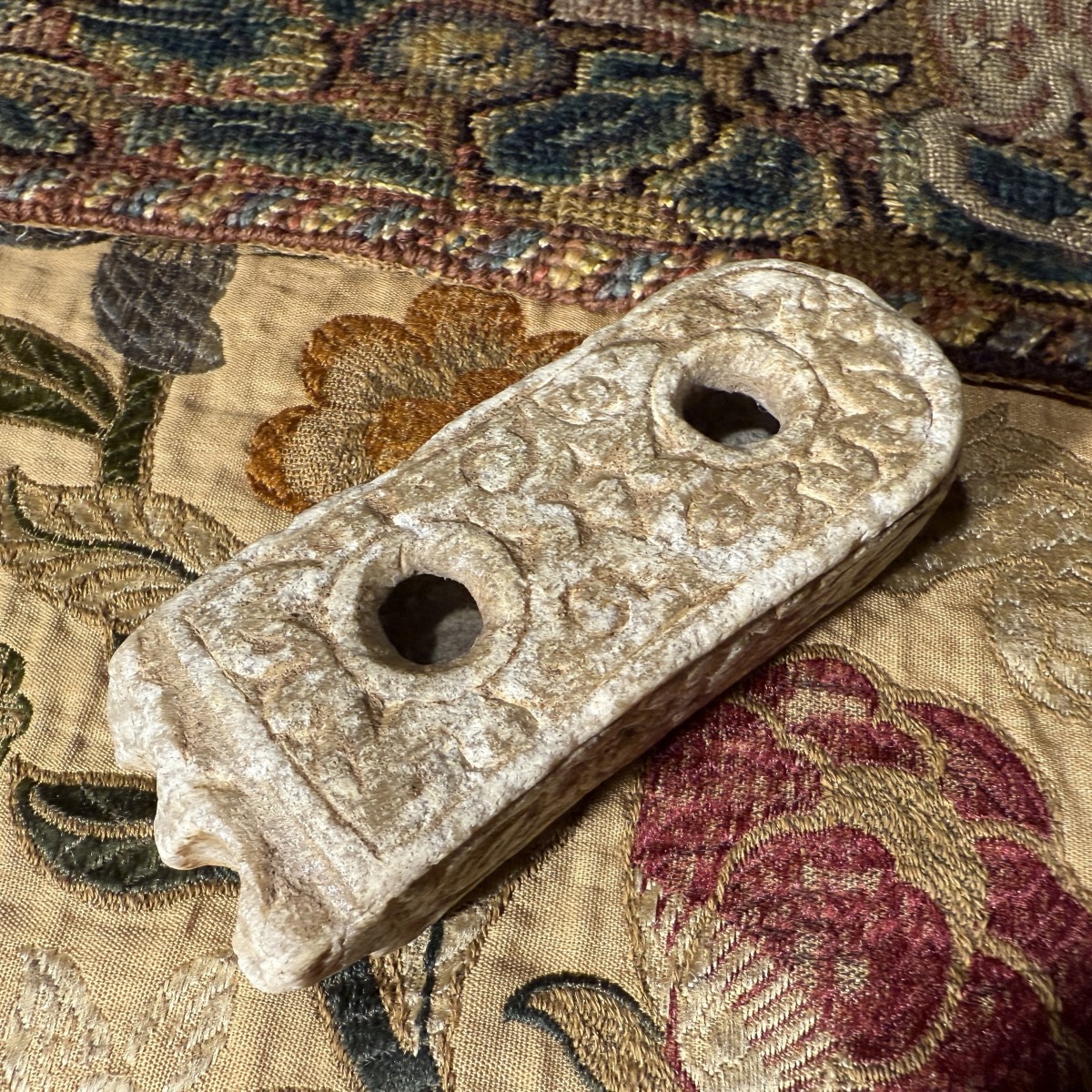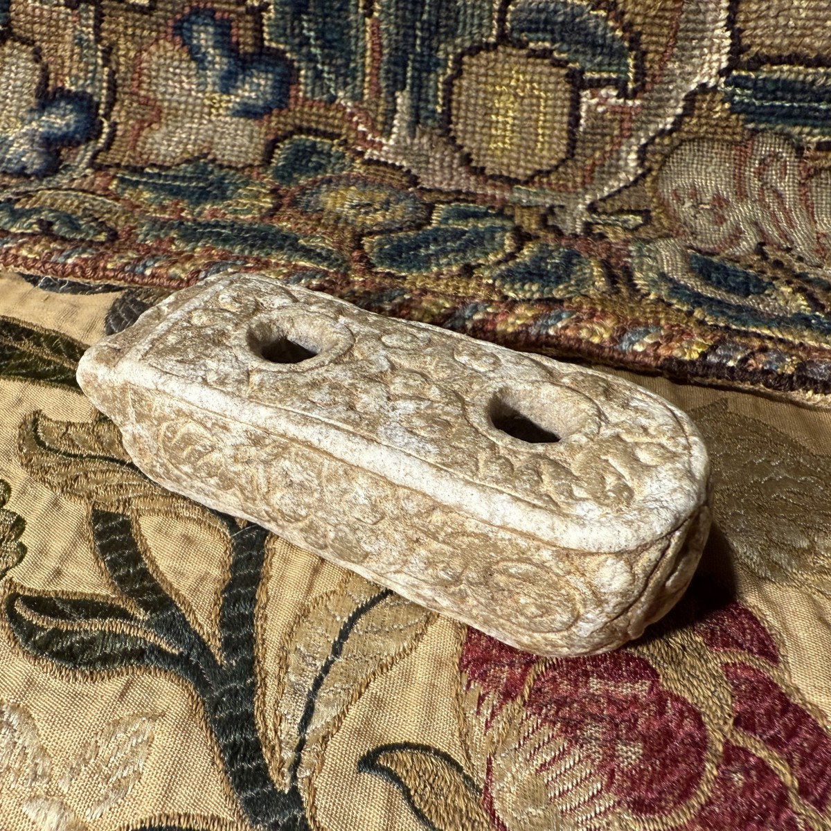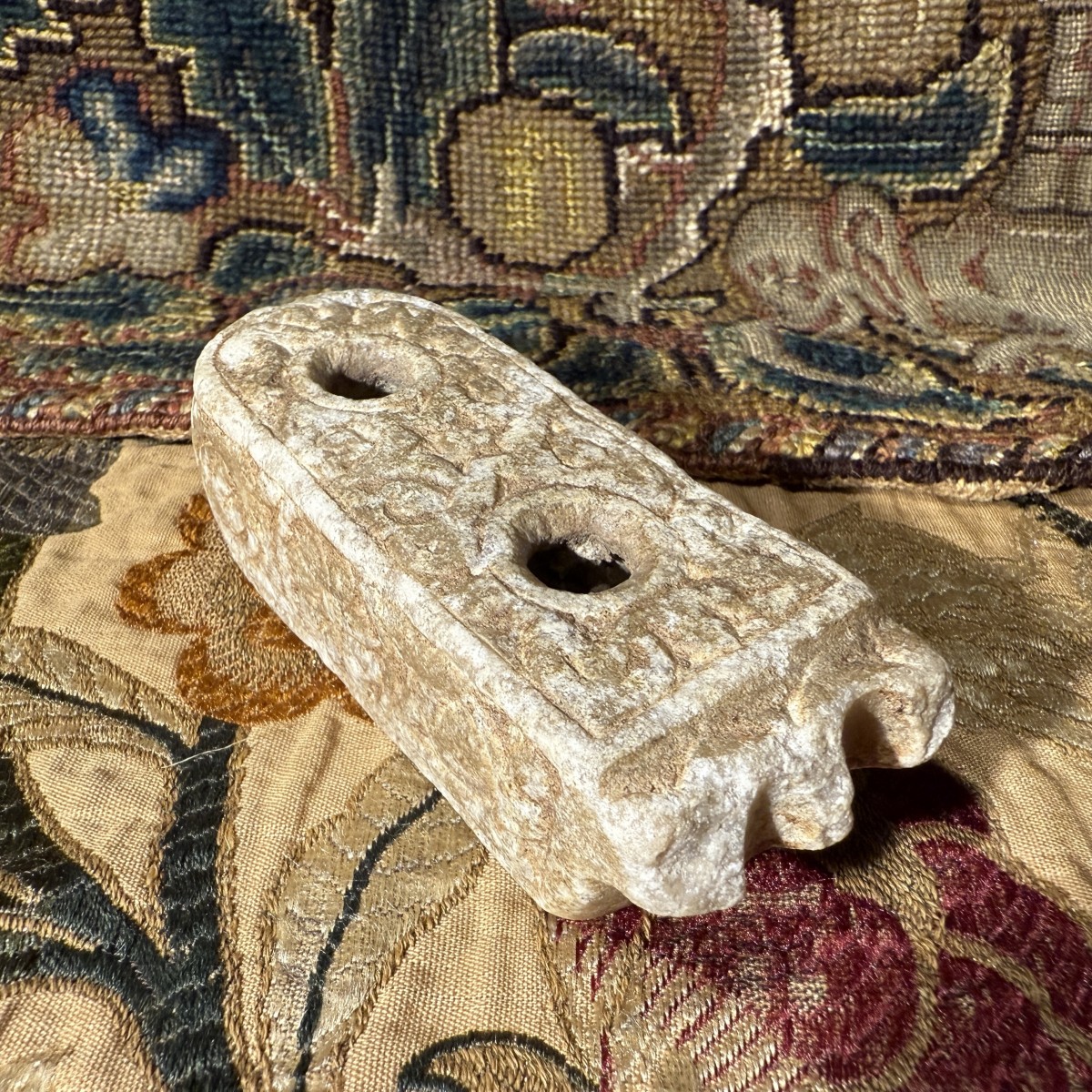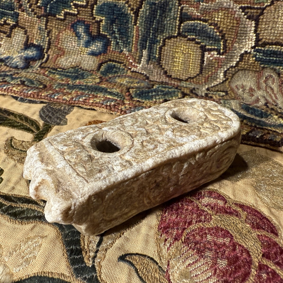 Cet encrier double compact est sculpté dans du marbre. Sa surface présente une patine légèrement usée, témoignant d'une longue utilisation. Le corps oblong est finement travaillé, l'une de ses extrémités courtes se terminant par une légère échancrure festonnée. La face supérieure comporte deux compartiments cylindriques verticaux à encre, dont les bords sont subtilement chanfreinés par l'usure. Autour des réservoirs se trouve un panneau sculpté en bas-relief, composé de motifs végétaux enroulés et de vrilles entrelacées, inscrit dans un étroit cadre en retrait. Les côtés présentent un décor en relief similaire, alternant rosettes et volutes, tandis que les faces inférieures arborent de grands motifs floraux stylisés.