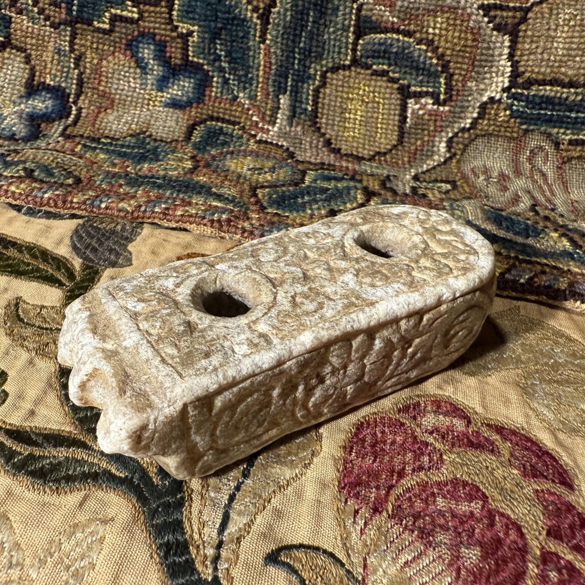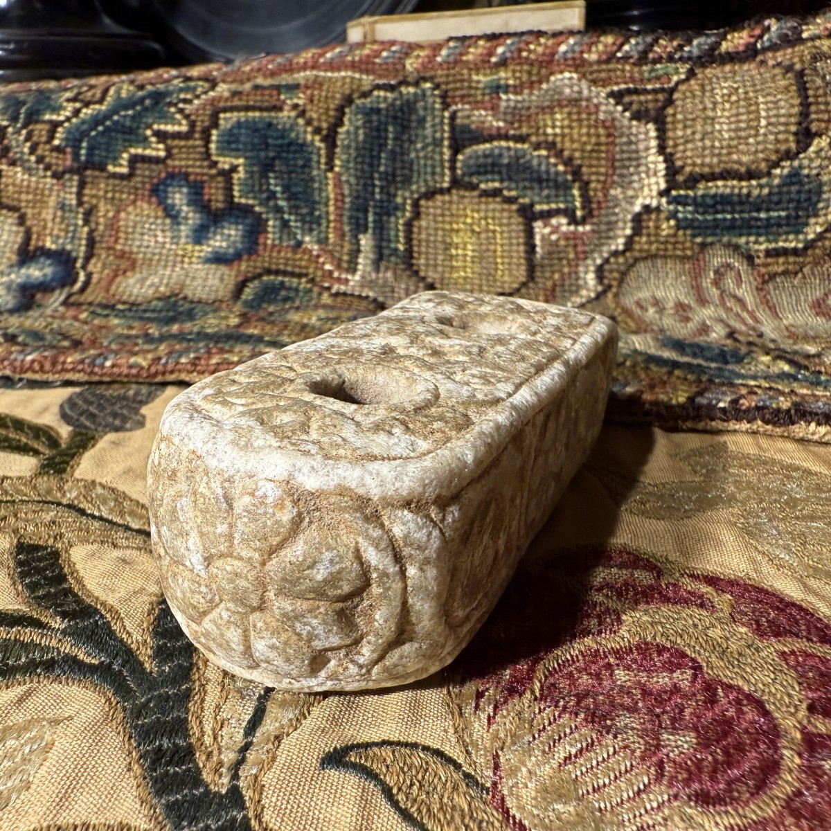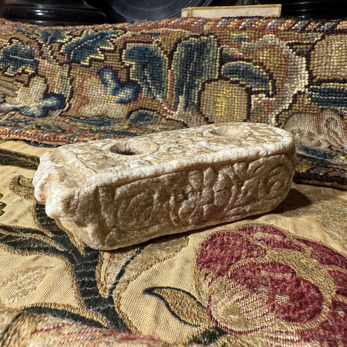 ... pigments noirs et rouges, notamment dans un contexte administratif et documentaire. Les encriers en pierre de ce type constituent une catégorie plus prestigieuse au sein de la vaste typologie des instruments d'écriture, généralement en bronze ou en céramique. Leur décor reflète les mœurs ornementales romaines des IIe et IIIe siècles apr. J.-C., où les reliefs végétaux et les rosaces étaient fréquemment employés sur des fragments architecturaux et de petits objets utilitaires.