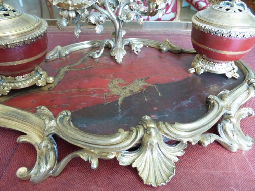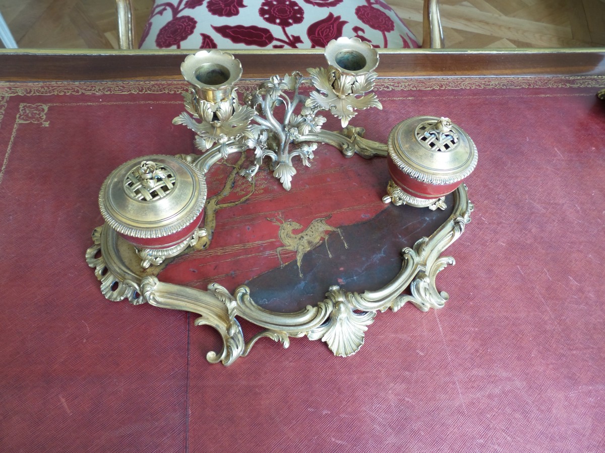 Encrier en bronze doré à deux bras de lumière de style Louis XV, le plateau est orné d'une laque de chine sur fond rouge.