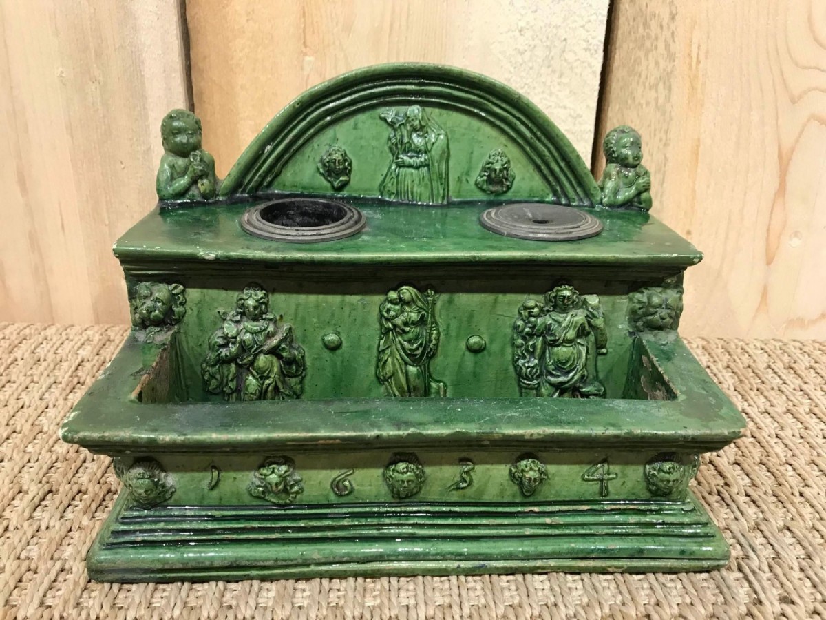 Encrier à gradins en terre vernissée à fond vert, à décor appliqué en relief de sujets religieux : Jésus Christ, Vierge à l'Enfant, saints et angelots.